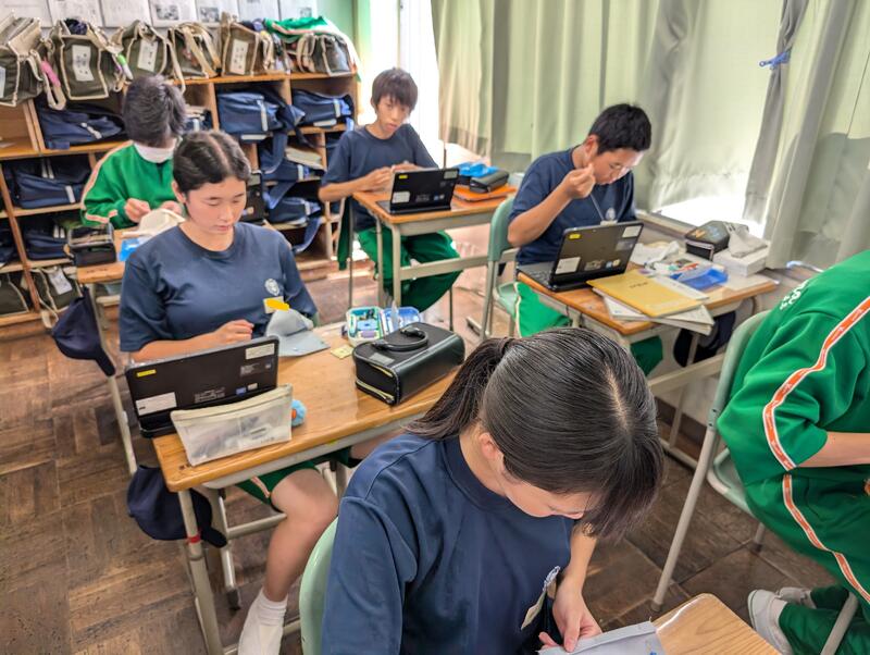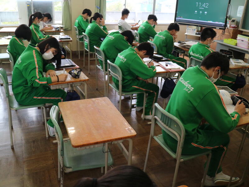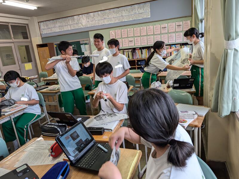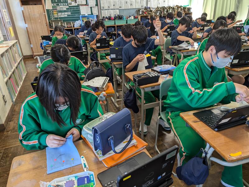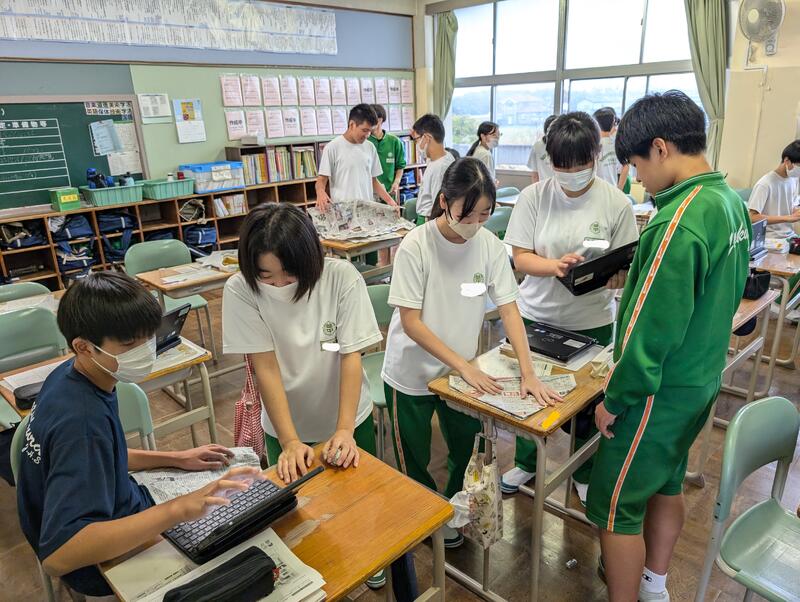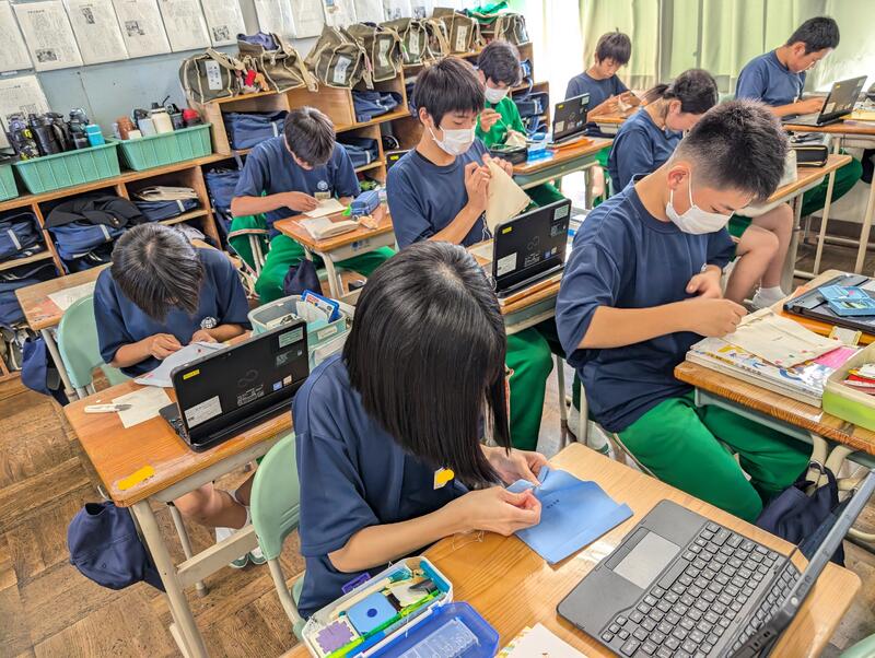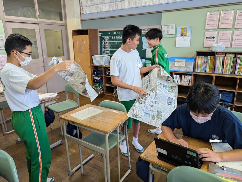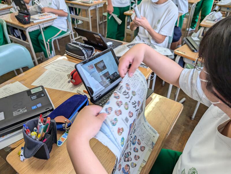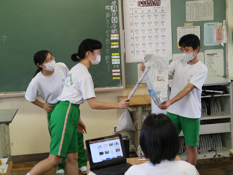幼児の生活について学んでいる3年生は、今日の家庭科の授業では、「新聞紙2枚」「10分以内」を条件に幼児の遊び道具について考えました。実は家庭科ノートに解答例はあるのですが、それは授業後まで伝えず自分たちなりのアイディアを活かして考えてもらいました。もちろん、目の前のタブレット端末を活用して調べる生徒も出てきます。使いこなしていますね。