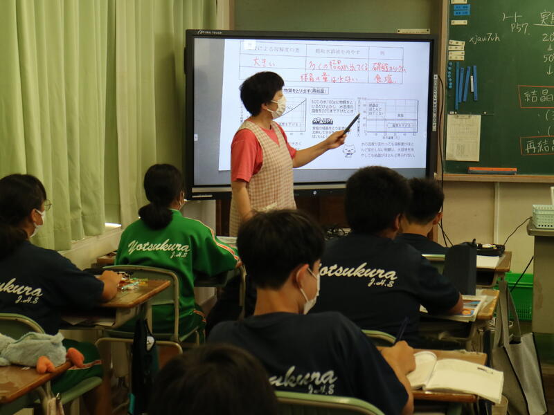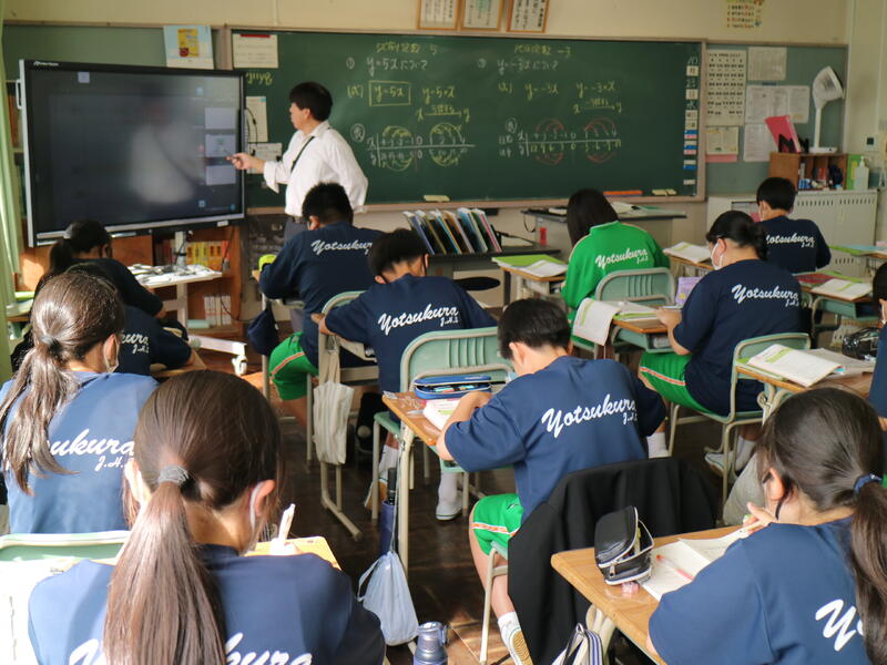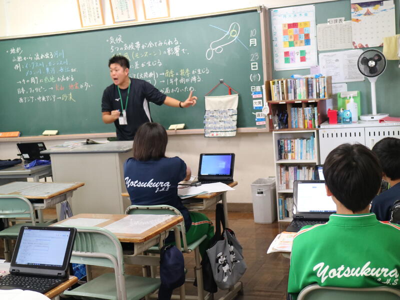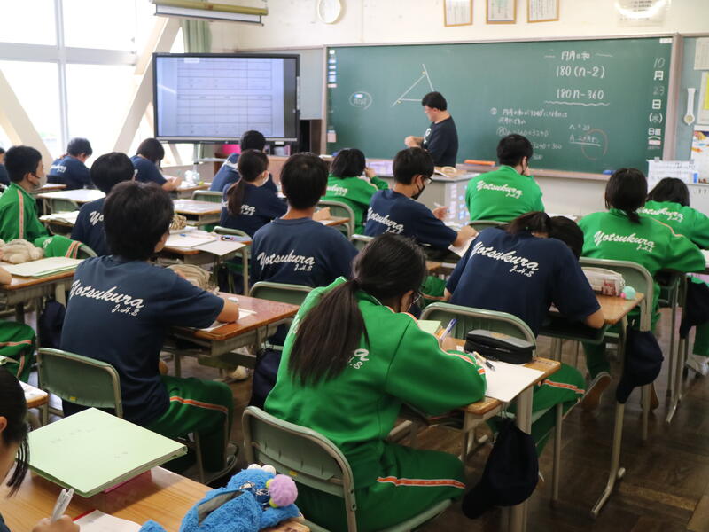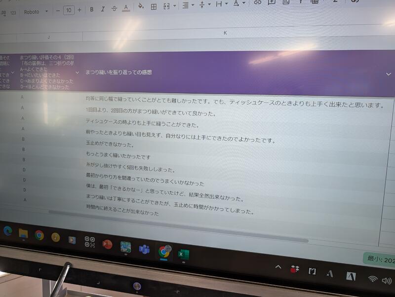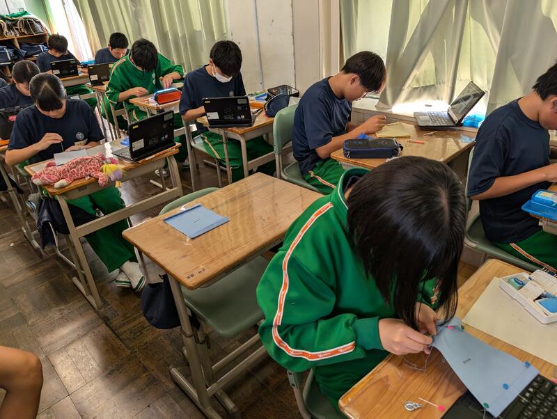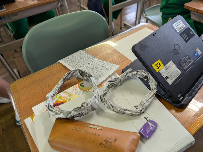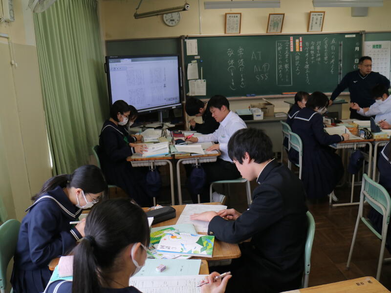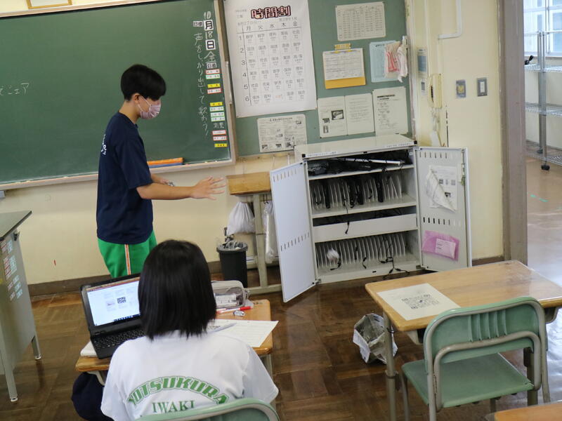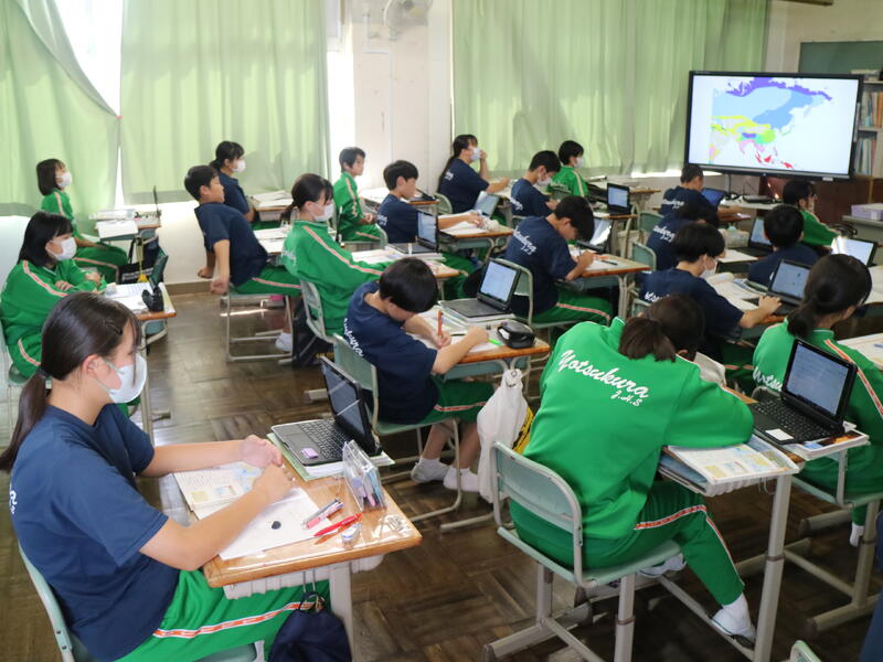 幼児の生活について学んでいる3年生は、今日の家庭科の授業では、「新聞紙2枚」「10分以内」を条件に幼児の遊び道具について考えました。実は家庭科ノートに解答例はあるのですが、それは授業後まで伝えず自分たちなりのアイディアを活かして考えてもらいました。もちろん、目の前のタブレット端末を活用して調べる生徒も出てきます。使いこなしていますね。