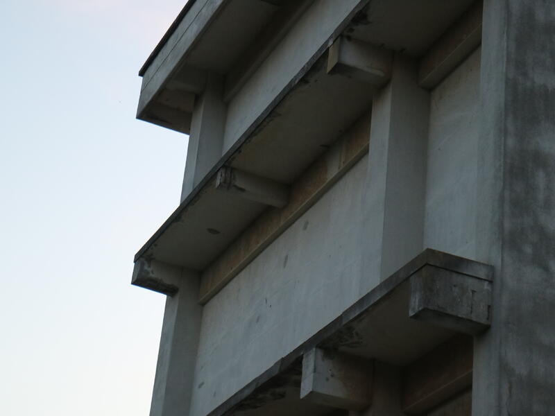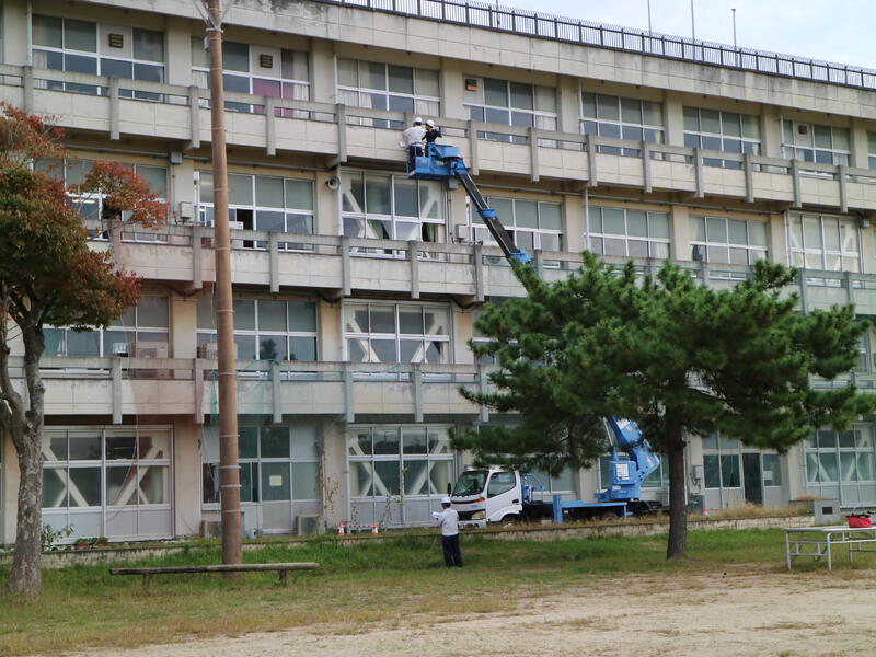 10月より、校舎の老朽化した外壁について、東側と南側を中心に調査と工事を行っています。特に、老朽化のひどい東側については、外壁の表面をあらかじめ落とす予定です。(このため、画像1枚目の箇所は通行できません。×東昇降口↔校庭)