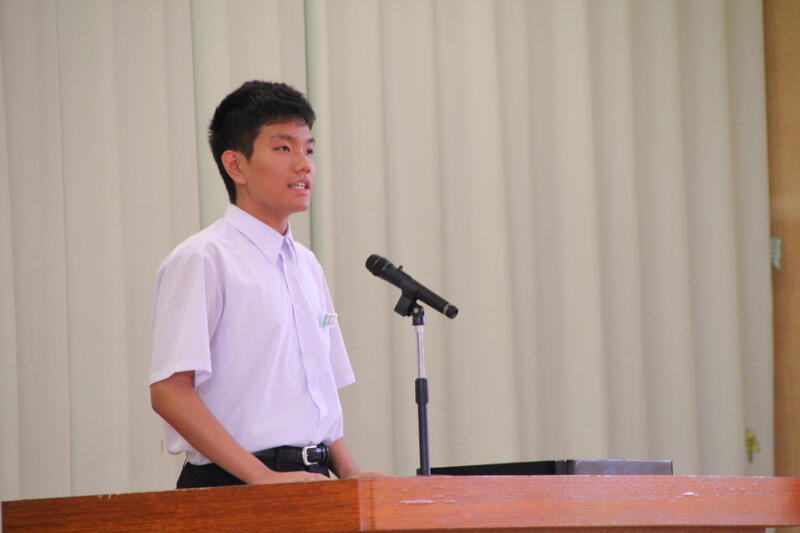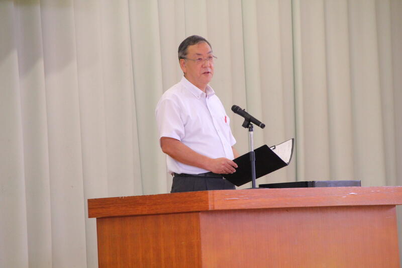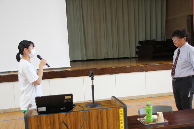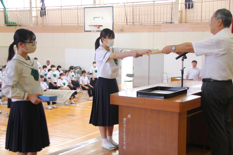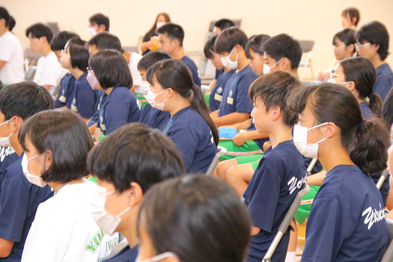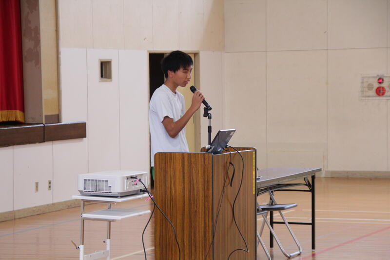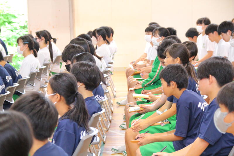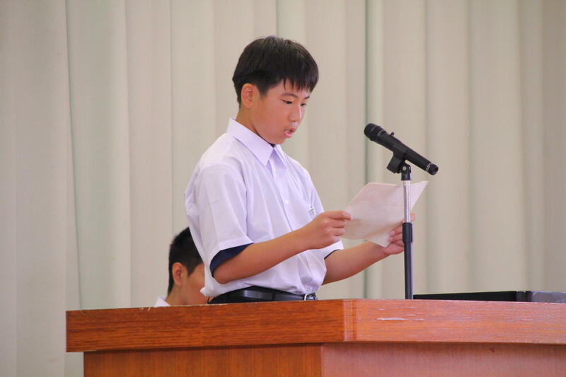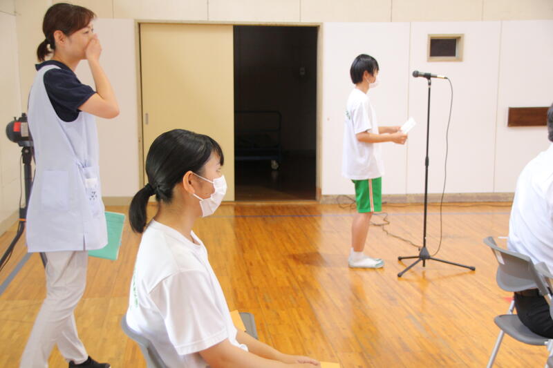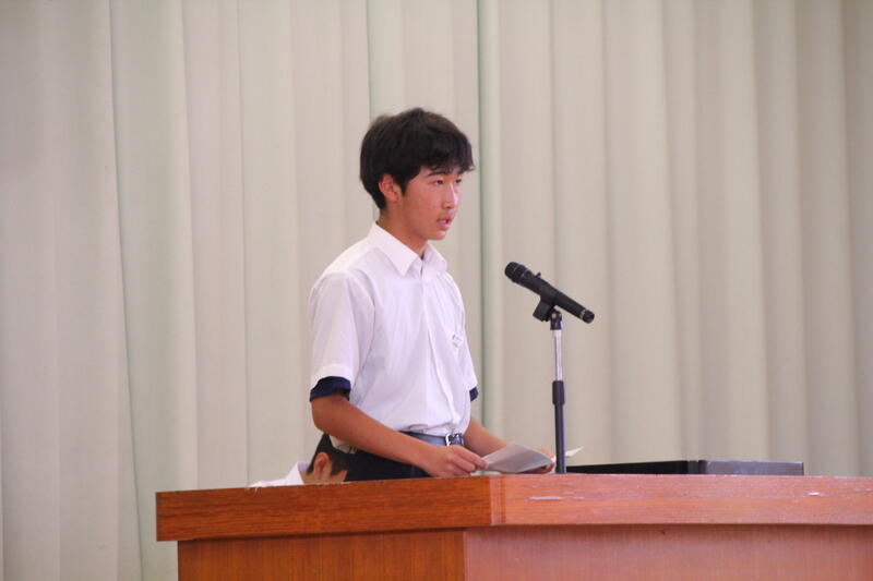 クラス替えから、大人数での生活に変わり、4月の遠足では交流を深め、修学旅行の練習をするという目的の達成されたことの話がありました。また、先輩のマネをするだけだった昨年度に比べ、1年生に教えながら参加した部活動という成果の部分と、無言移動ややりたいこととやるべきことを区別するといった課題が述べられ、まずは夏休みに規則正しい生活を送ることと学習と部活動の両立を心がけるという抱負が述べられました。
