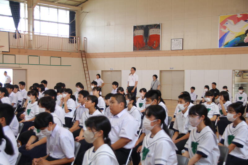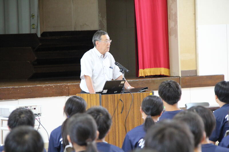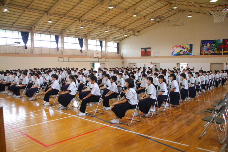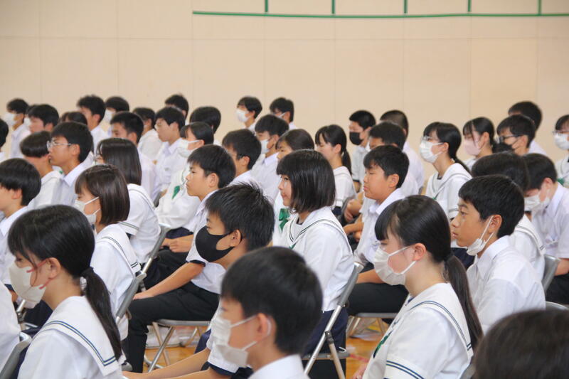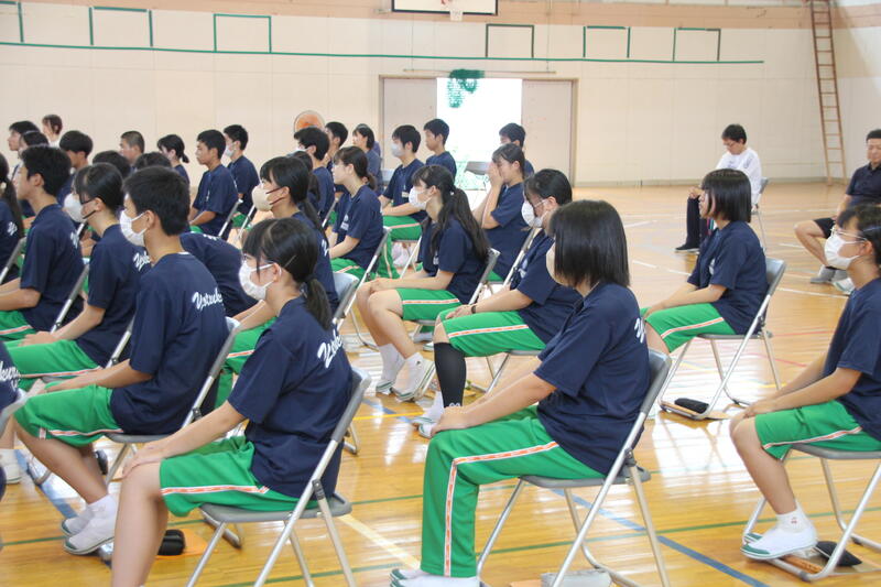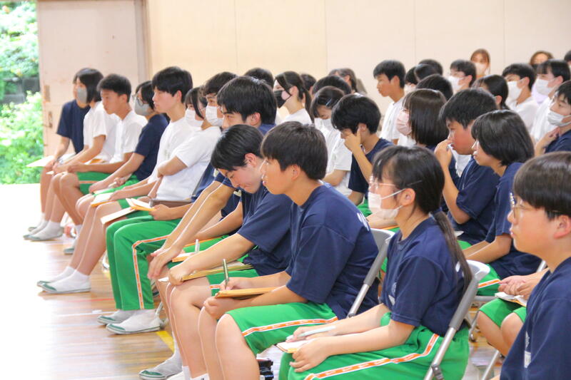 1学期を振り返り、メリハリのある生活が送れたことや、部活動で3年生が1,2年生を引っ張る姿といった成果についての話がありました。また、先日行われた携帯電話やインターネットの使用状況調査の結果に触れながら、家庭でのルール作り、生命を守る安心な生活、心身の健康の保持増進に努めることや、立てた計画ををしっかりと実行することといった夏休みの過ごし方についての課題が話されました。
