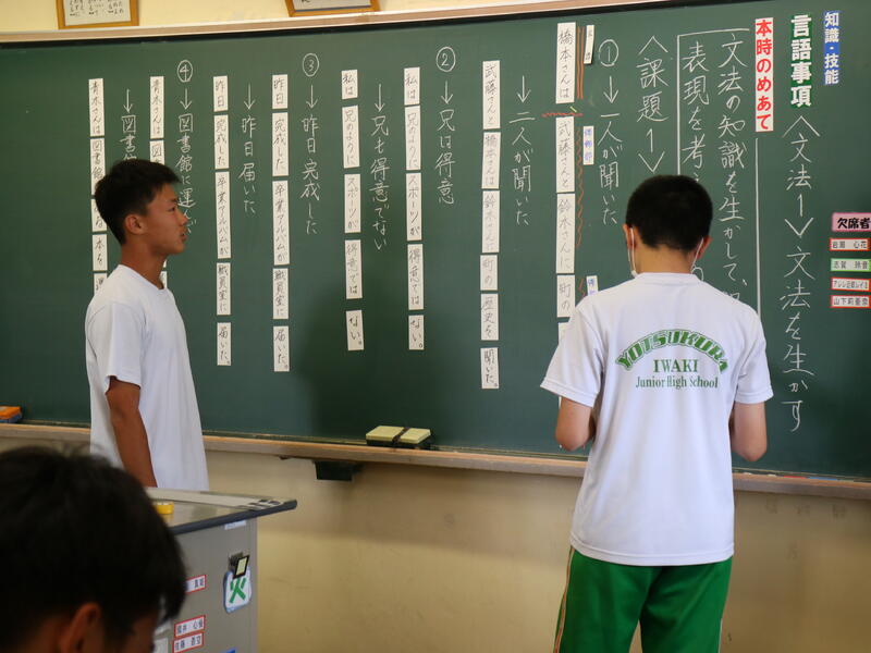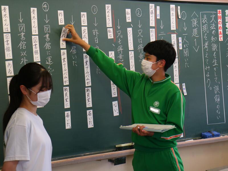 その後、「工夫しないで読むと、文脈が正しく伝わらない文」について、読点を打ったり、文節の入替を行ったりすることで意味を明確にする方法について班で確認し合い、その結果を発表しました。黒板の前に出て、それぞれの生徒が考えを発表する場面がありました。