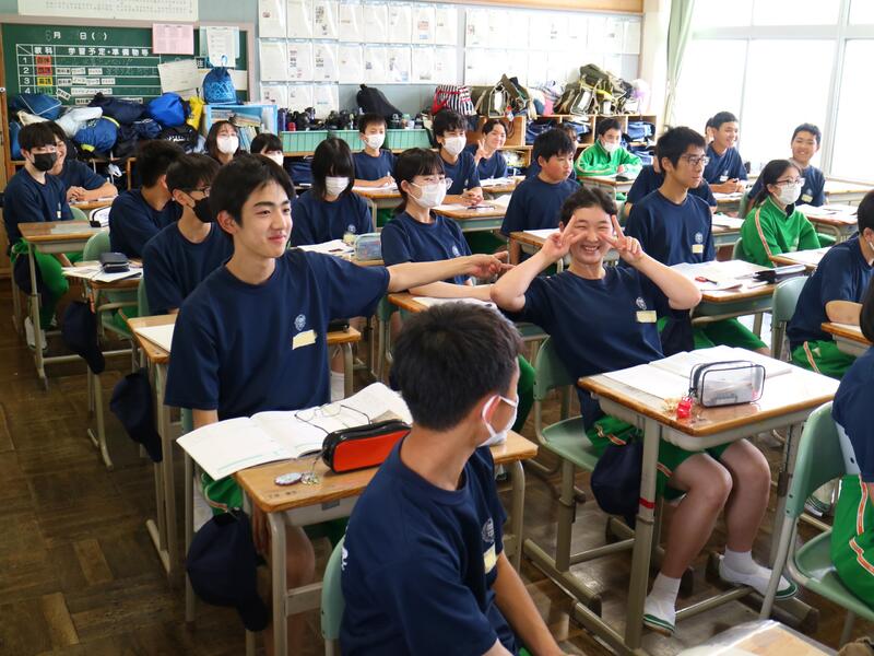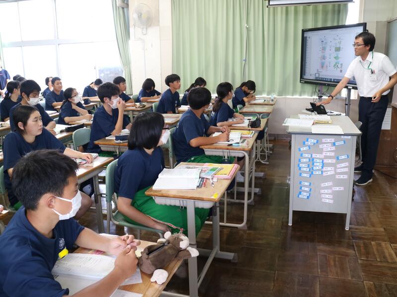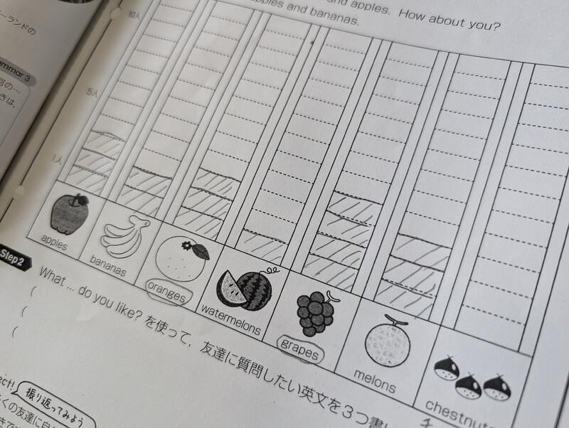 本日の一年生の英語の授業では、Whatの後ろにもう一語ついた「まとまりの疑問詞」について学習しました。授業の中では、男子女子に分かれて、好きな果物調査を英語で行いました。英語を使って、意欲的に対話活動に取り組んでいました。