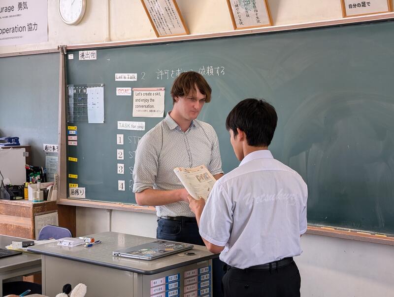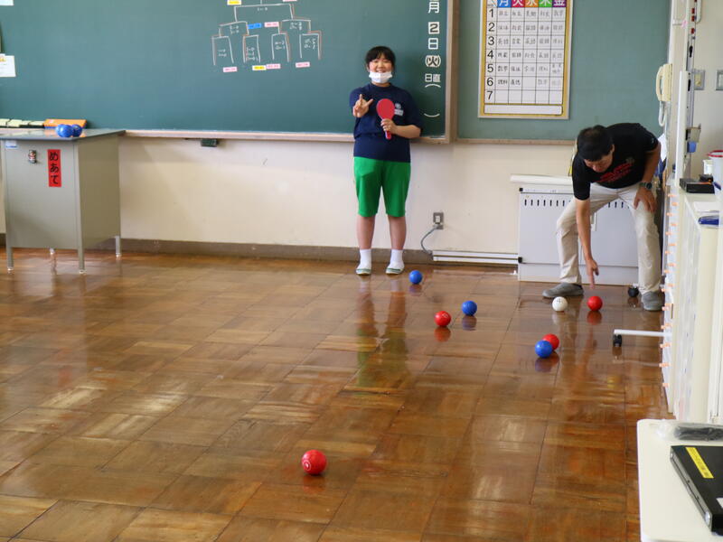 2年1組の英語の授業では、ALTの先生と「ちょっとお願い」の題材で対話活動を行っていました。