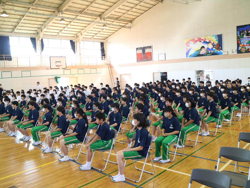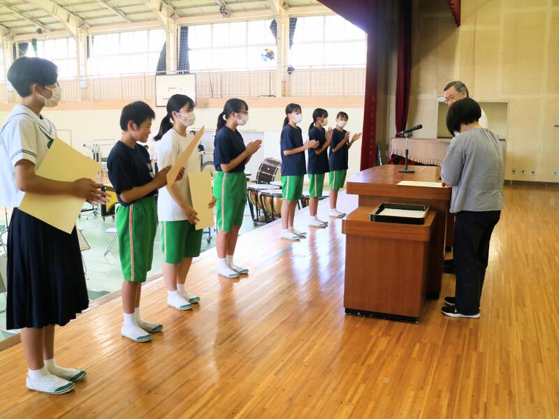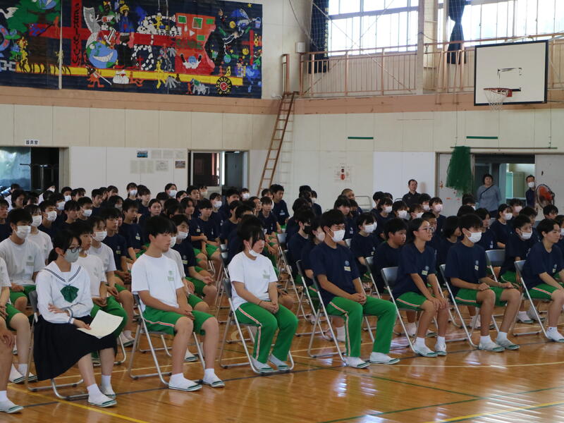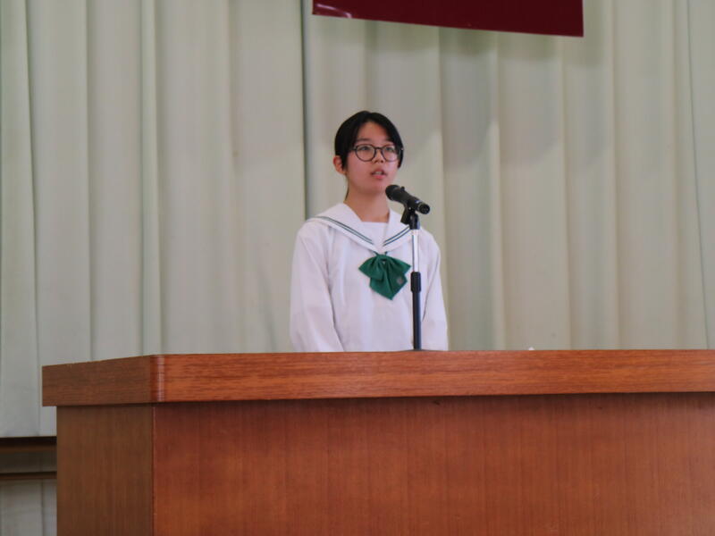 また、この場を借りて来週の北地区弁論大会に参加する3年生が作文発表を行いました。日常生活にある大切な思い、誰かの役に立つこと、そんな行動に気づけることなどについて心を込めて読み上げました。来週の大会も頑張ってきてほしいと思います。