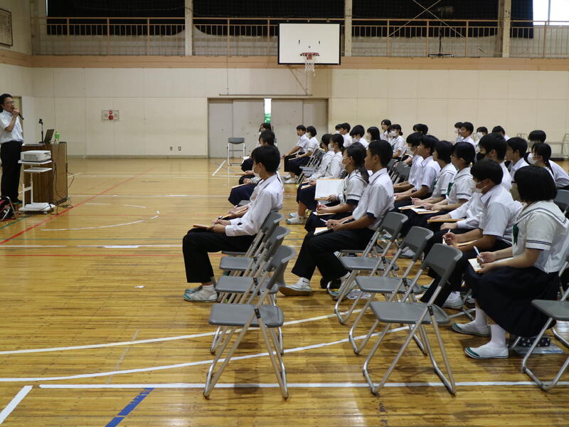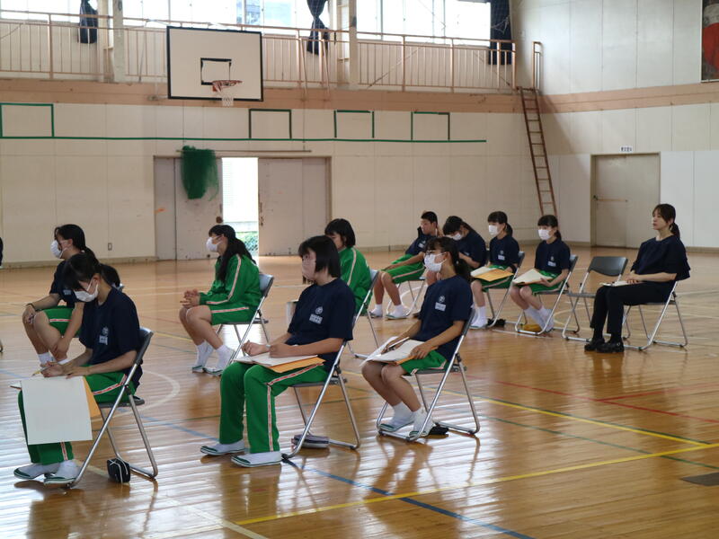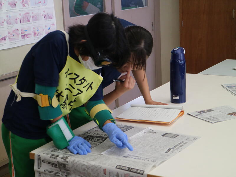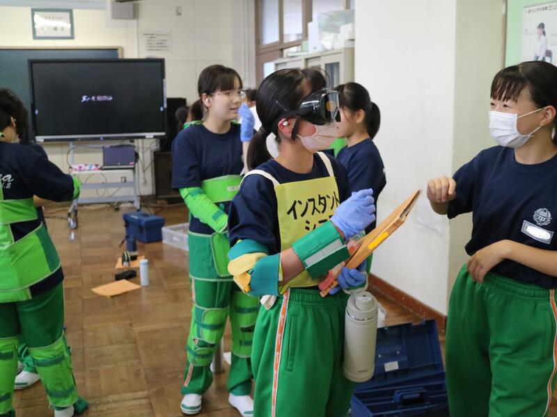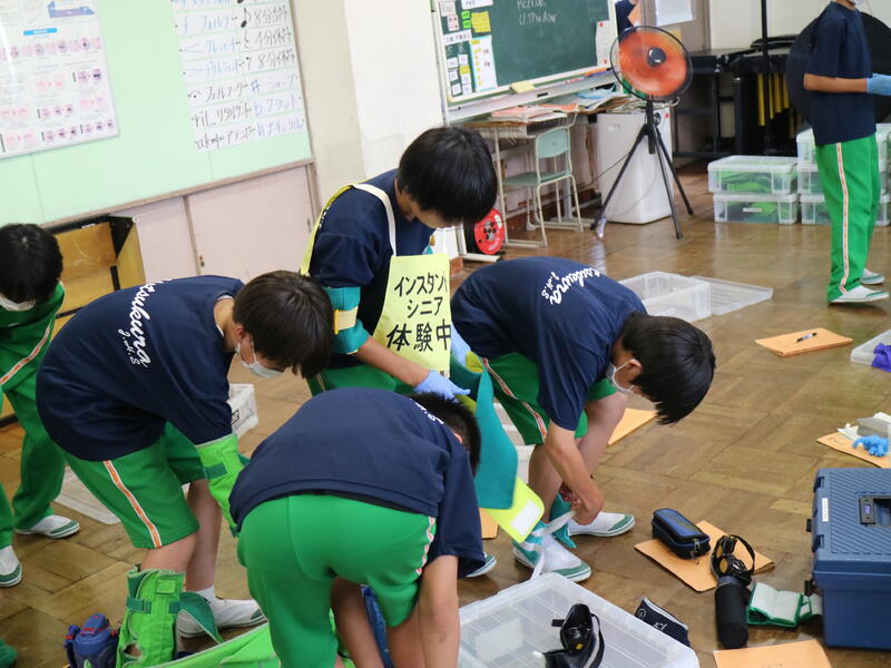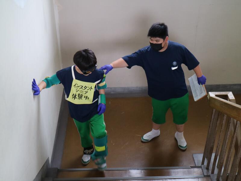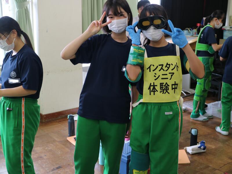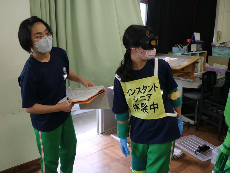 3年生が高校説明会を行っている頃、1年生は東日本国際大学より講師の先生をお迎えして「インスタントシニア体験(高齢者疑似体験プログラム)」を行っていました。これは、運動・感覚機能を一時的に低下させ、高齢者の身体的な老化や、心理面の影響を知り、他人事ではなく自分の将来の問題として認識するためのものです。