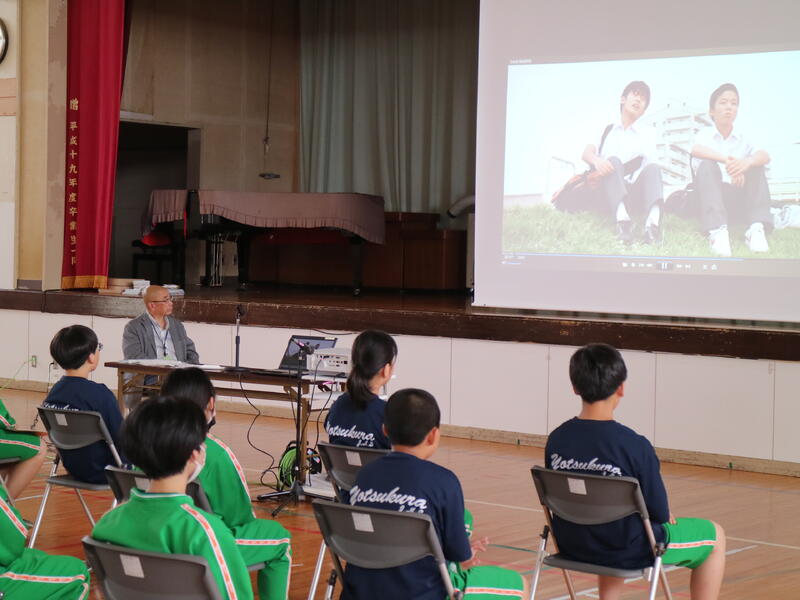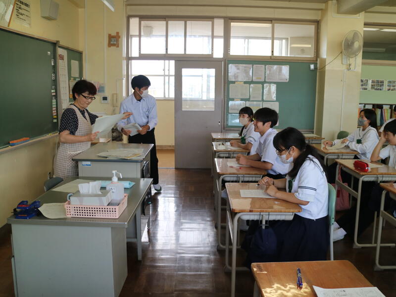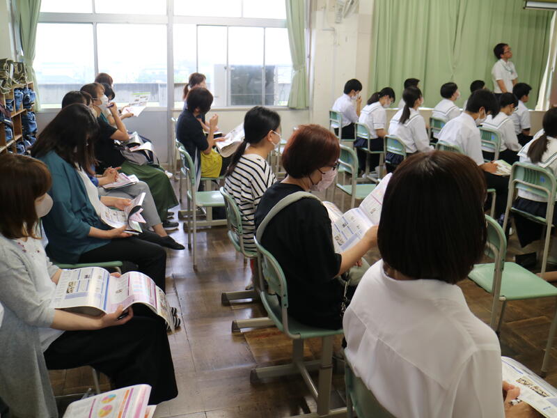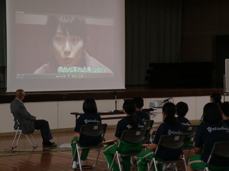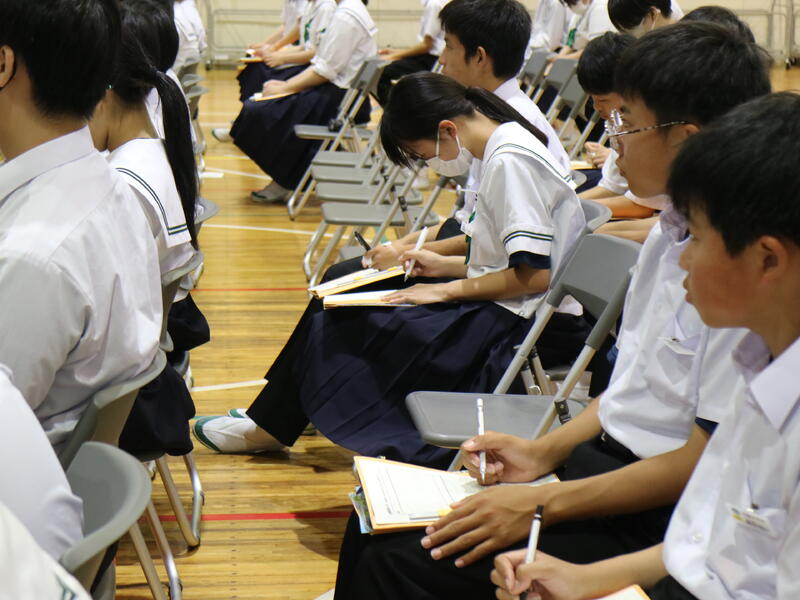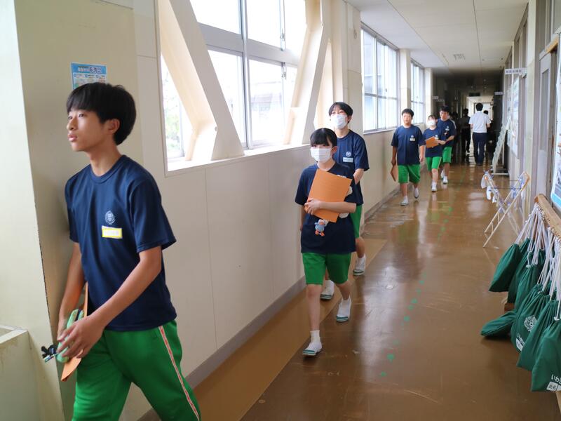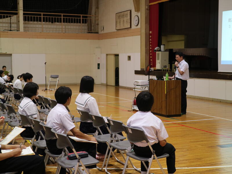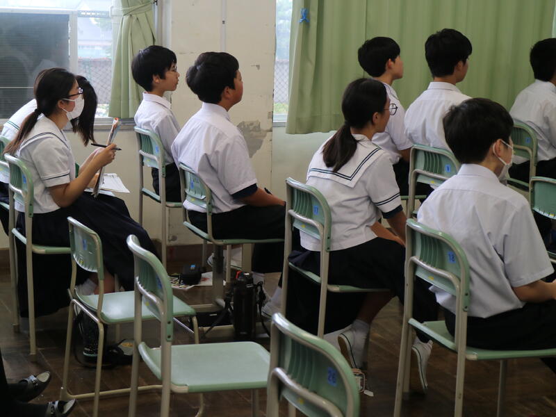 3年生が高校説明会を行っている頃、1年生は東日本国際大学より講師の先生をお迎えして「インスタントシニア体験(高齢者疑似体験プログラム)」を行っていました。これは、運動・感覚機能を一時的に低下させ、高齢者の身体的な老化や、心理面の影響を知り、他人事ではなく自分の将来の問題として認識するためのものです。