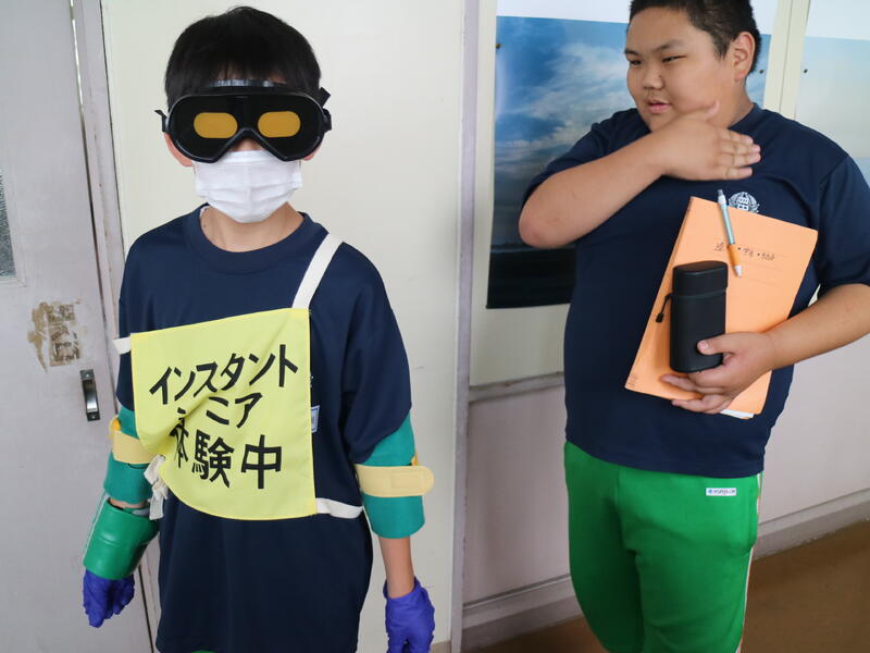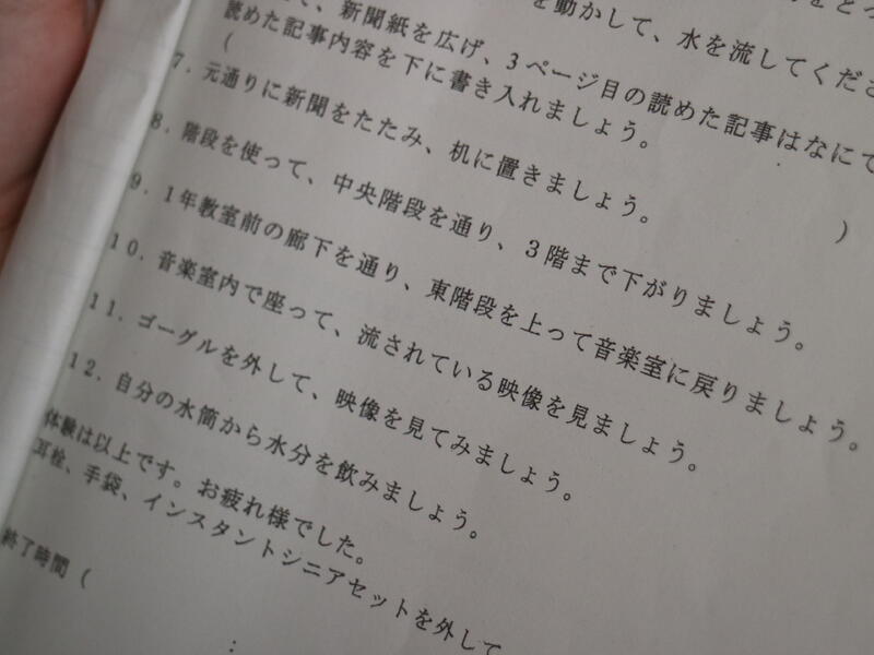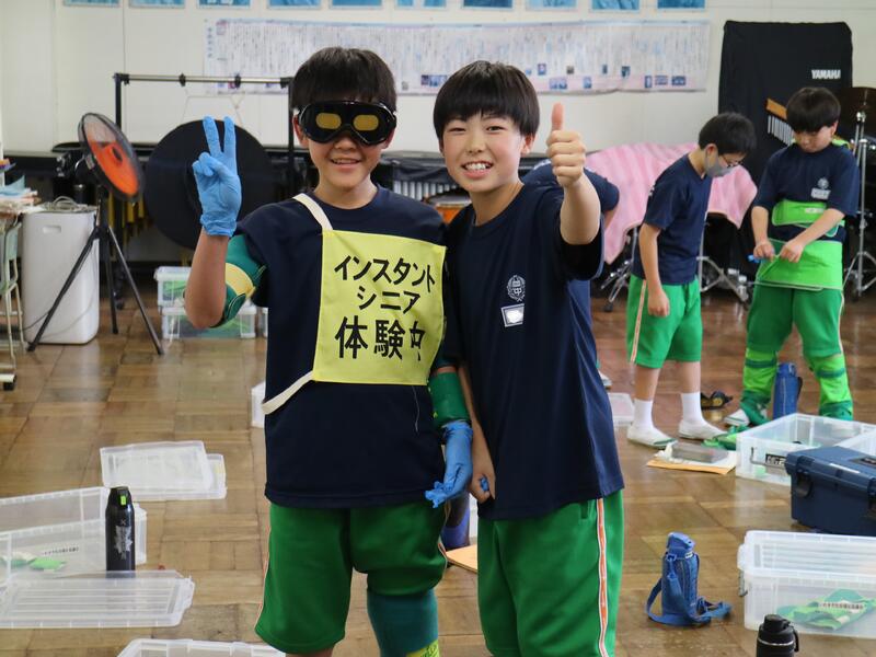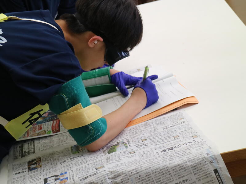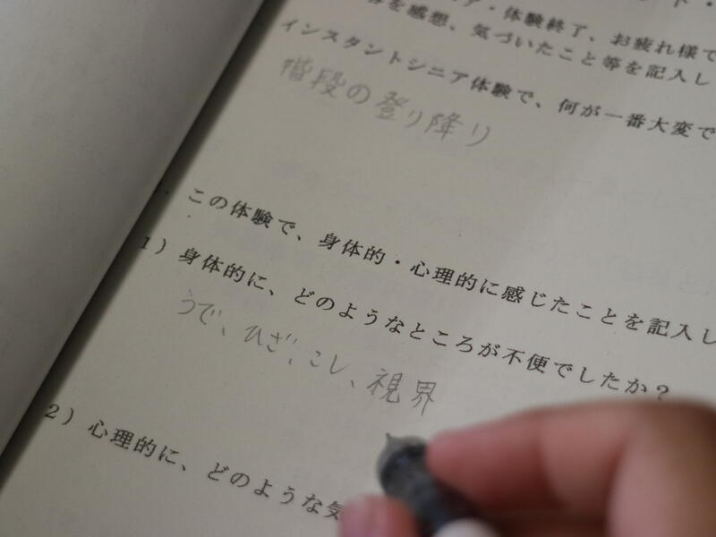 手首足首に重り、耳栓や視界を狭くするゴーグル、そしてグローブを着用し、不便さを体験します。「重い重い」、「見えない~」、「意外とイケます」など反応は様々です。