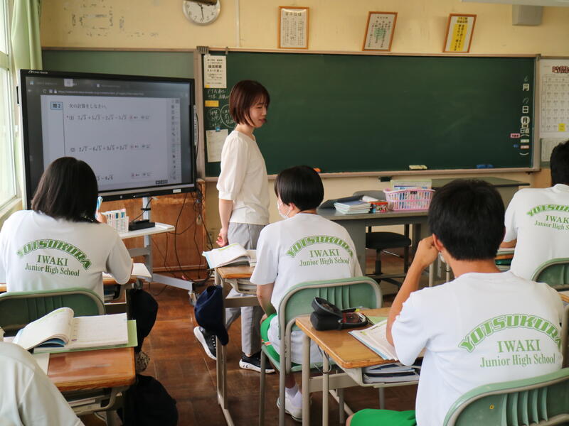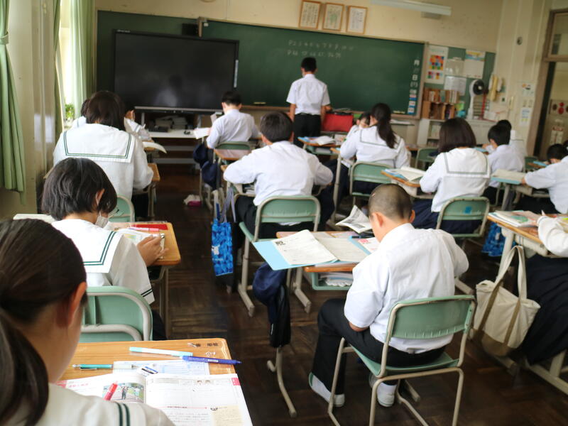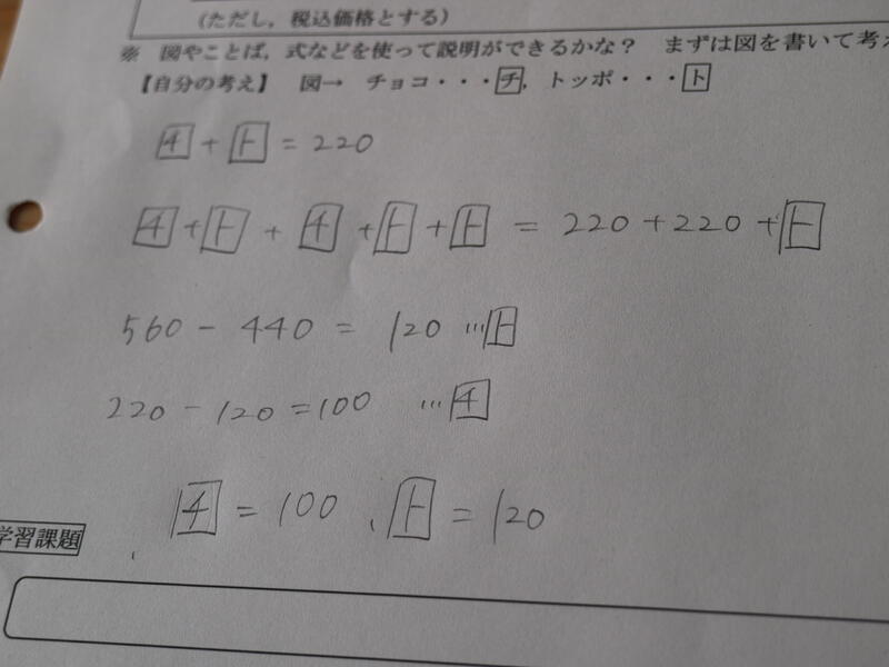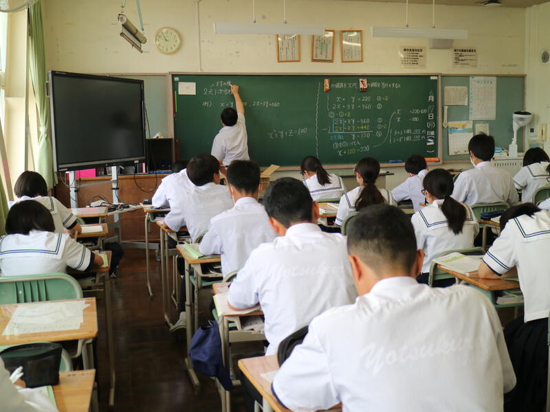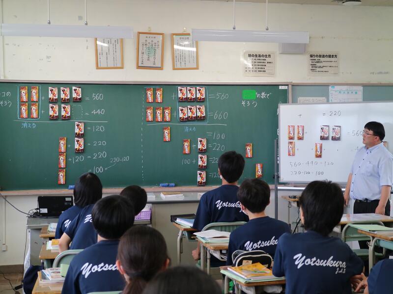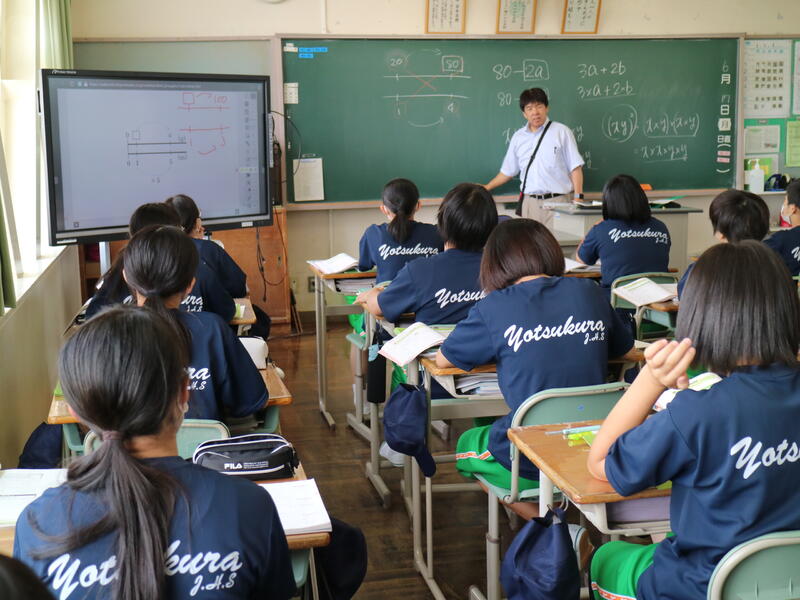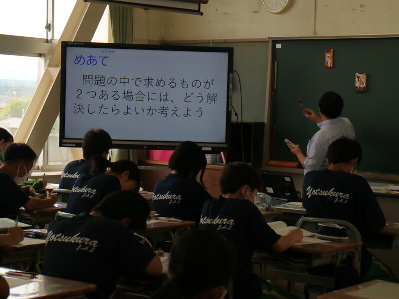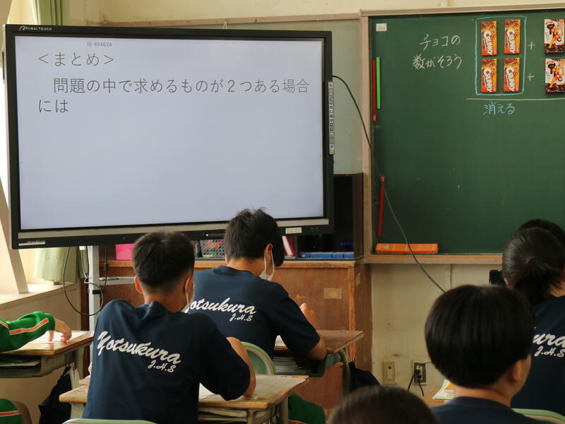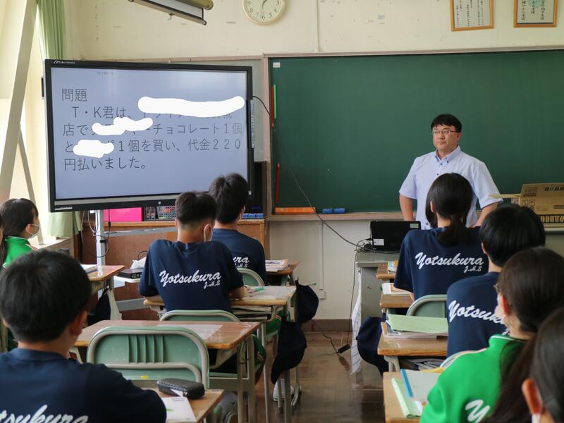 本日は、2年2組で数学の研究授業が行われました。題材は、連立方程式。本時では、考え方を学ぶため、まずは小学校高学年の児童でも分かるような解き方で考えてみます。
