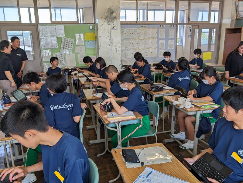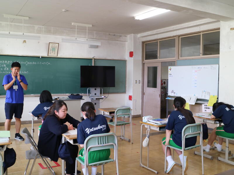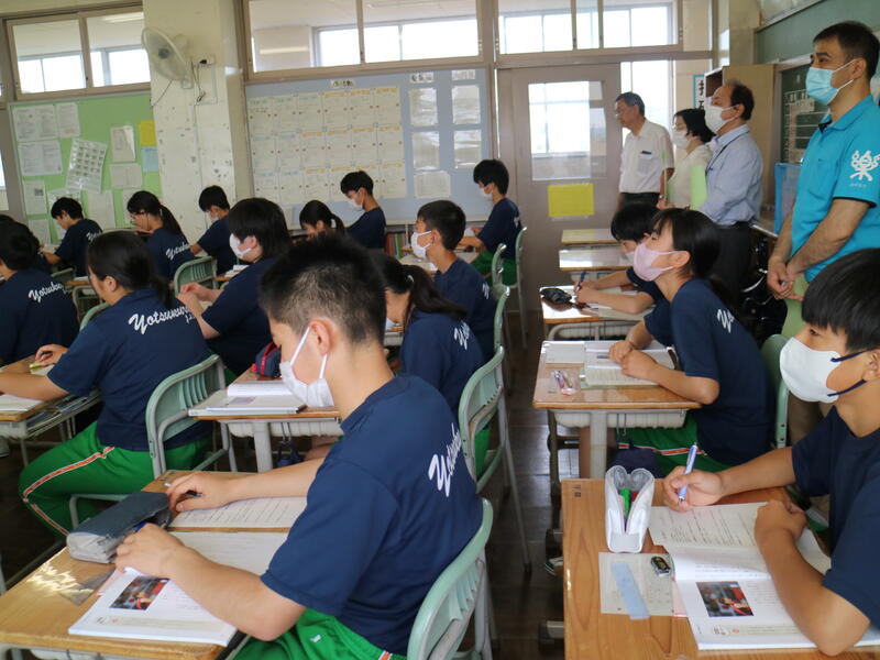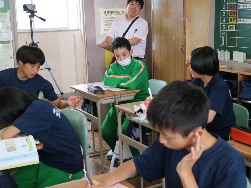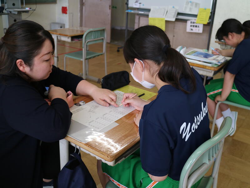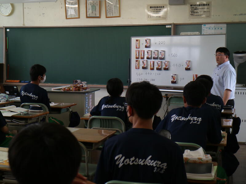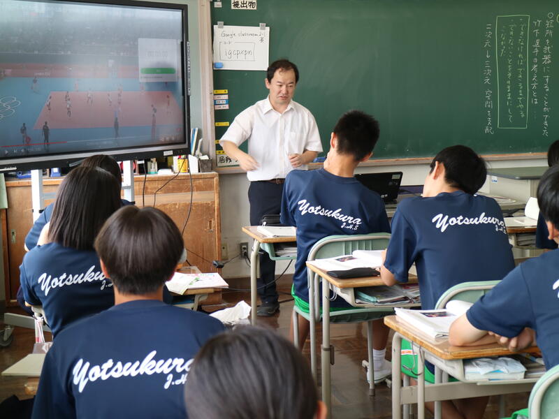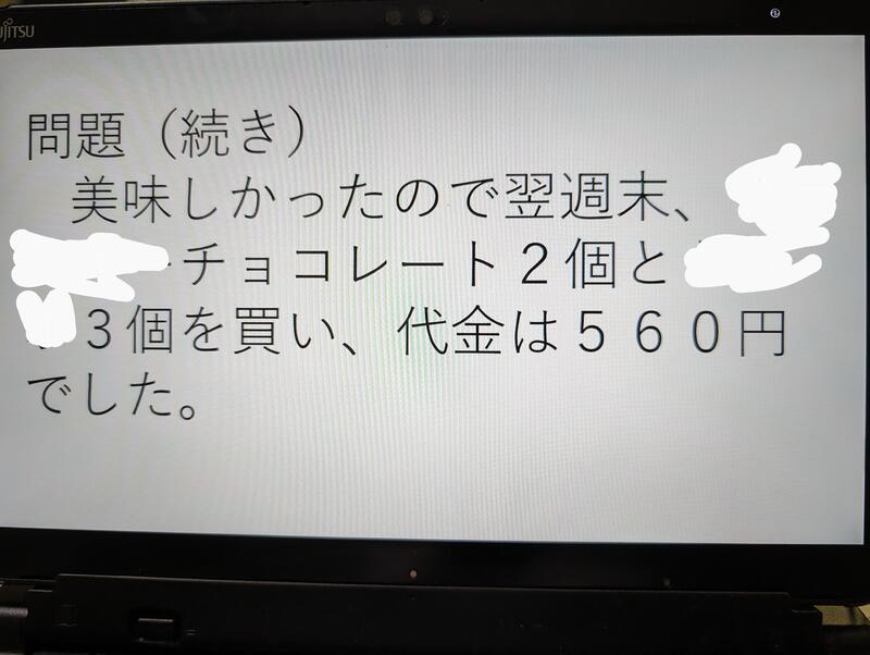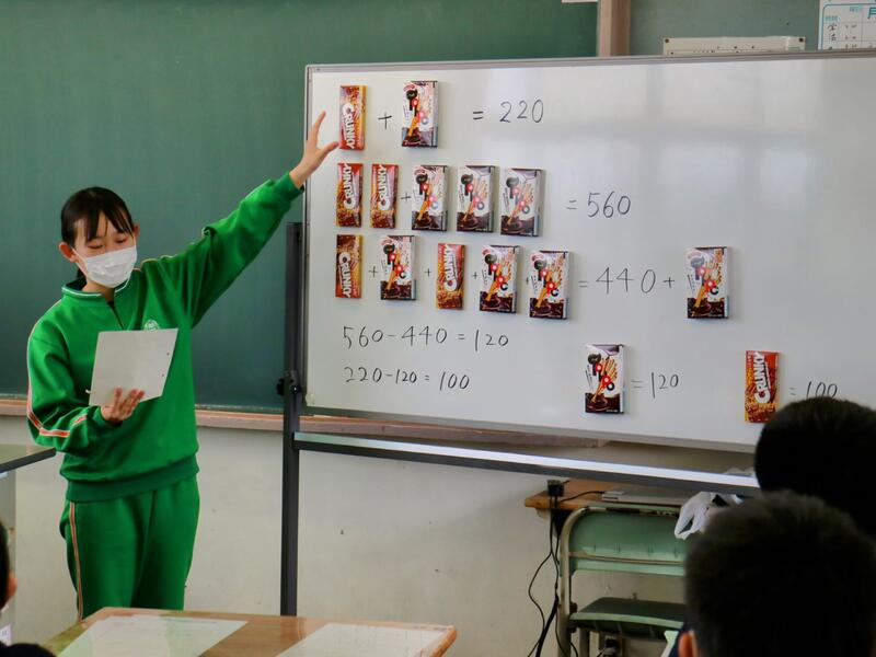 本日は、2年2組で数学の研究授業が行われました。題材は、連立方程式。本時では、考え方を学ぶため、まずは小学校高学年の児童でも分かるような解き方で考えてみます。