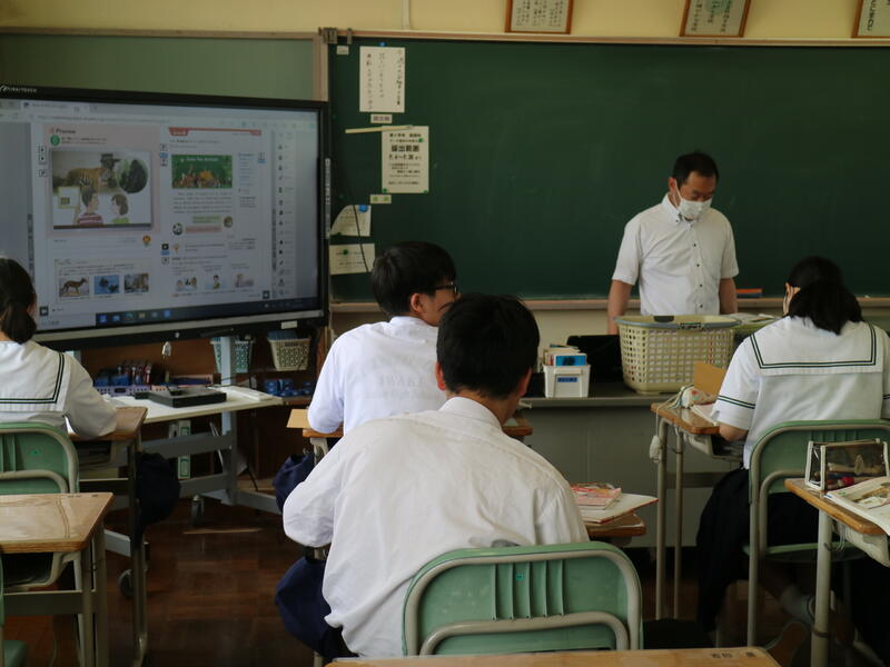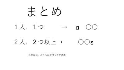 本日の1年3組の授業では、「名詞」の単数形や複数形などを学習しました。英語には数えられる名詞と数えられない名詞があること、単数形の前には「a」がつき、複数形は名詞の後ろに「s」がつくことなどを学習しました。
