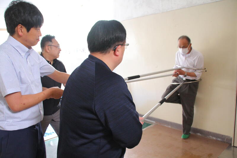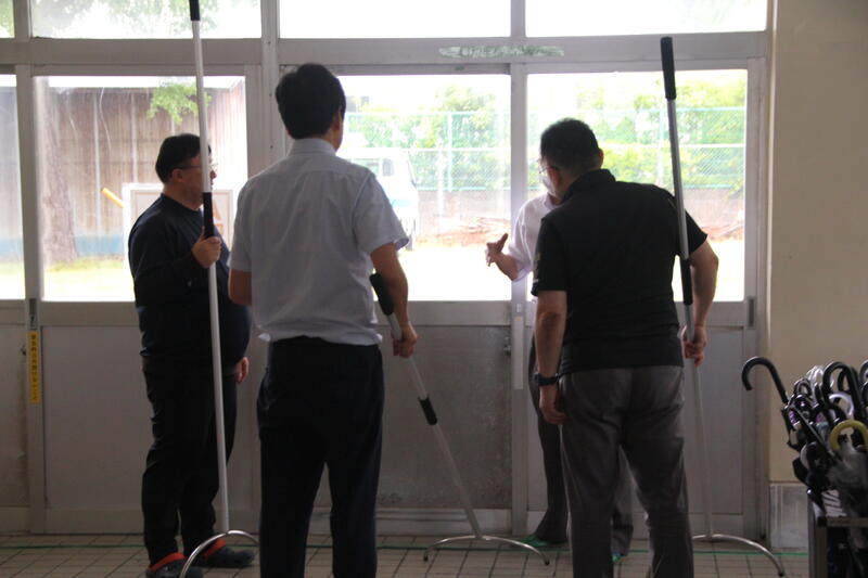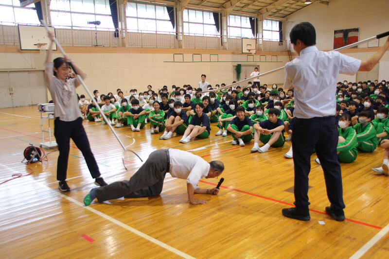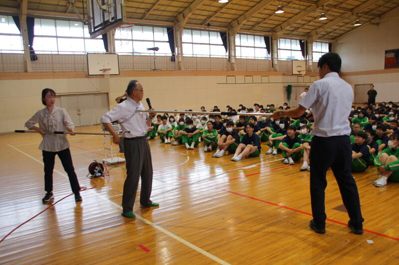 続いて、中央署の方々からは、避難に取り組む態度が優れていたこと、学校外での不審者への対応等についてお話しいただきました。さすまたを使った実演も行っていただき、本校職員の危機管理能力も上がりました。