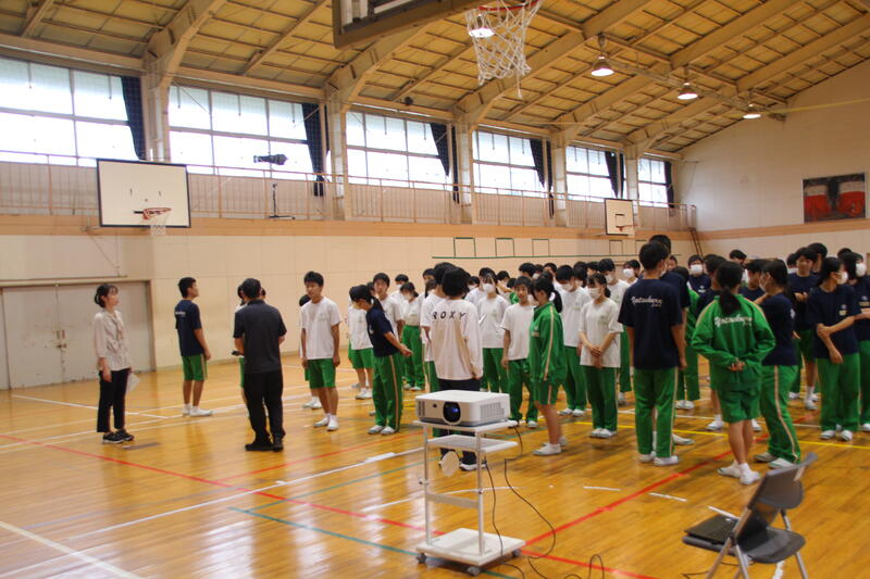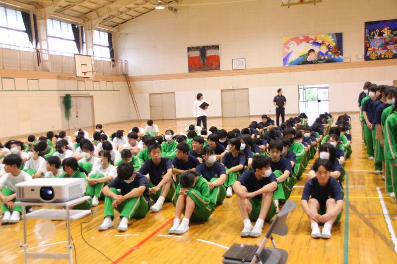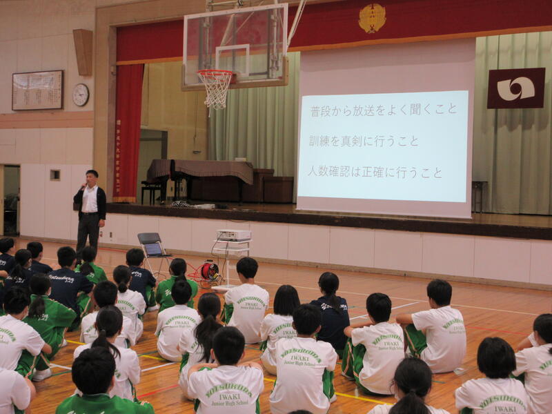 体育館に移動し、反省と講評の時間となります。ここからの人数確認が実は大切だったりします。現実には、けがをして動けなかったり、怖くて出てこれなかったり、返事ができない状態などということも想定されます。それは一刻を争う事態。先生方も真剣な態度で人数報告をしてくれました。