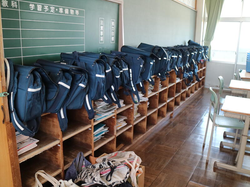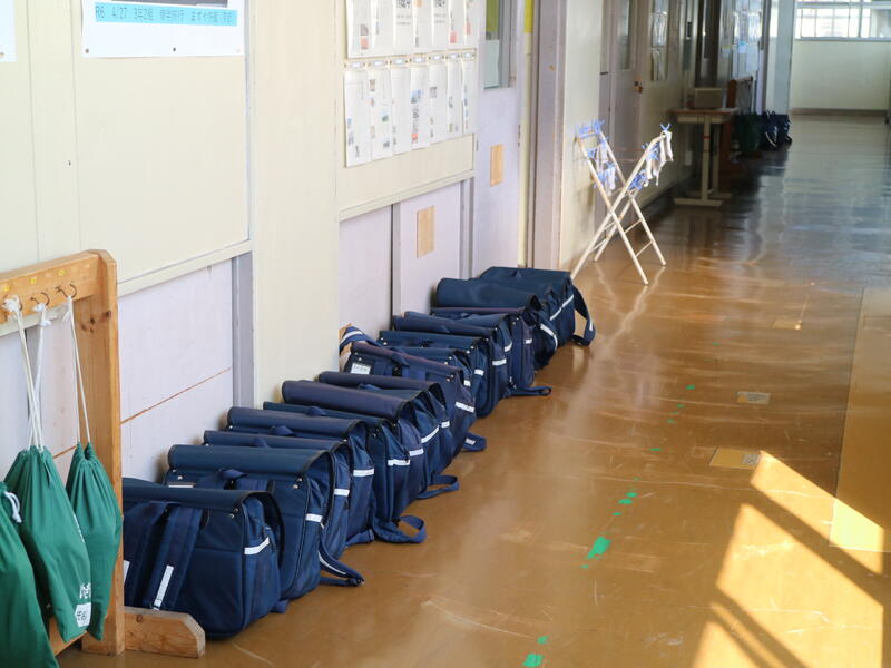 学習用具は入試を意識して、教室内ではなく廊下に置きます。2年生は、廊下では入りきらないため別室を使用。