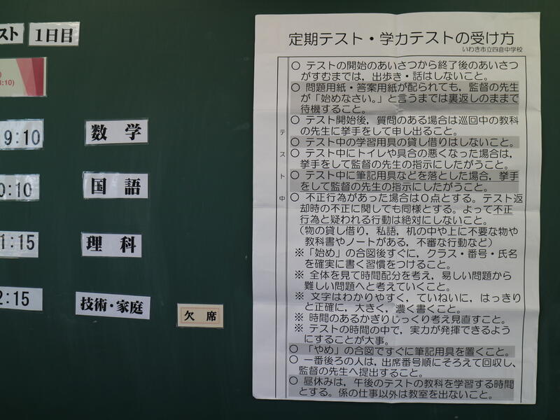 1日目の4教科が終了して、間もなく下校となります。あと1日、全力を尽くして頑張りましょう。明日は、晴れやかな顔で下校できますように。