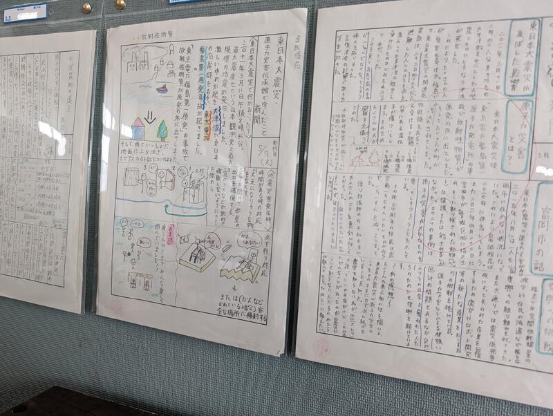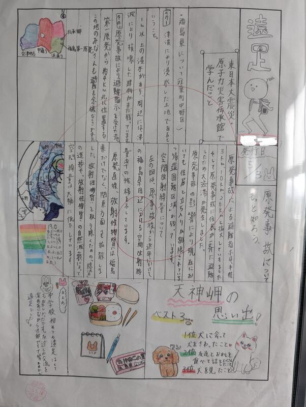 1年生の各教室を回ると、生徒達の遠足新聞が続々と仕上がっている様子が見えました。説明だけになりすぎず、パンフレットや写真でスペースを稼いで終わり…などといった手抜きもなく、力作揃いです。その一部を紹介したいと思います。