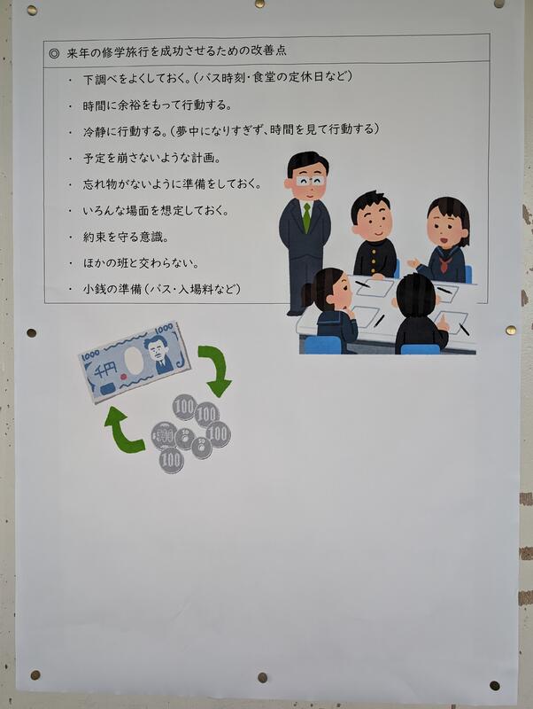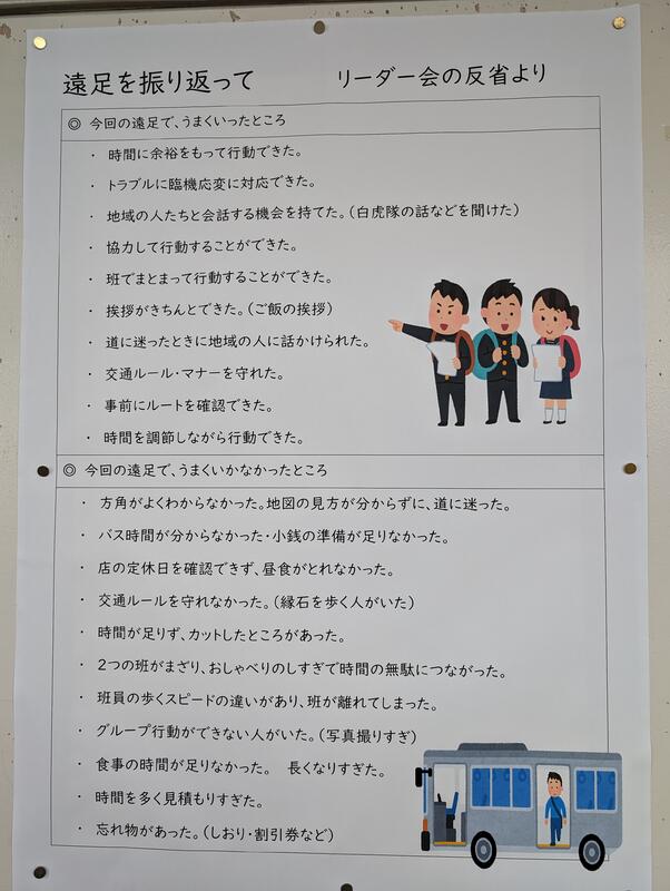 今回の遠足の位置付けは来年度に行われる修学旅行の班別自主研修の予行演習。研修の反省も、実行委員の皆さんによってしっかりと行われたようです。