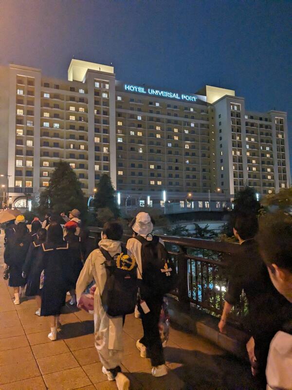 USJを満喫し、ホテルへと向かいます。心配された天気もどうにか持ち堪え、大きく崩れることなく園内で楽しむことができました。現在、ホテルへと向かっています。