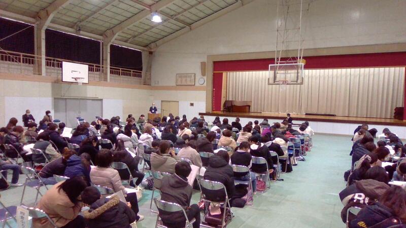 説明会。児童と保護者の皆さんに並んで聞いてもらいました。