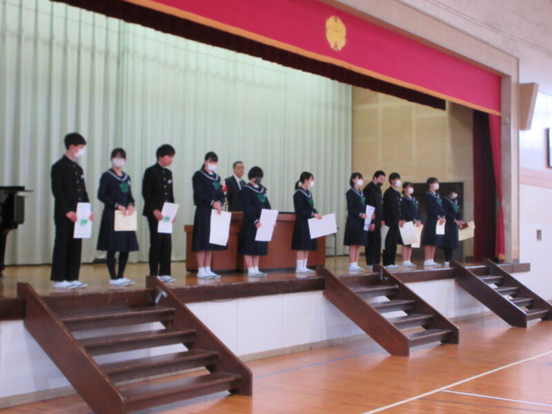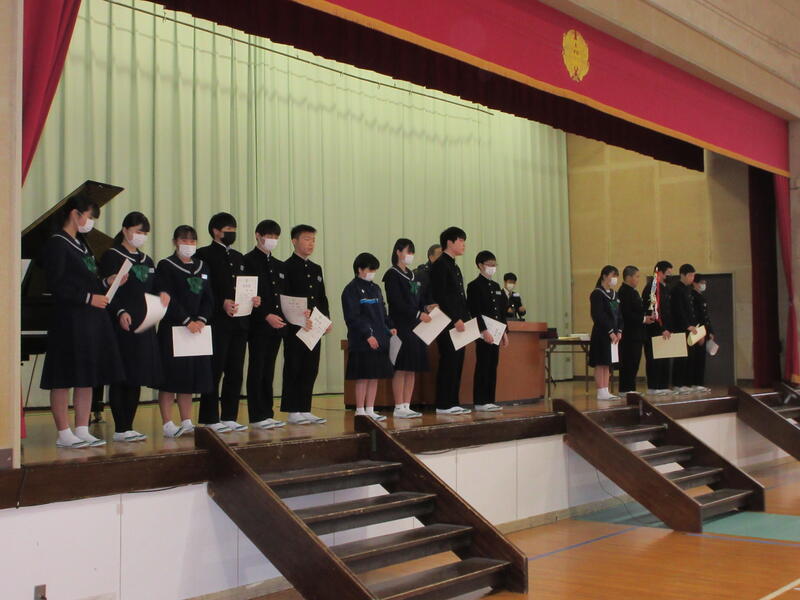 練習に先立ち、表彰を行いました。四倉中生の活躍が変わらず目覚ましく、今回もたくさんの生徒が表彰されました(書道・美術・柔道昇段審査・バレーボール・吹奏楽・ソフトテニス・水泳等)。