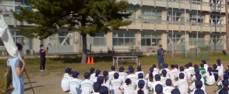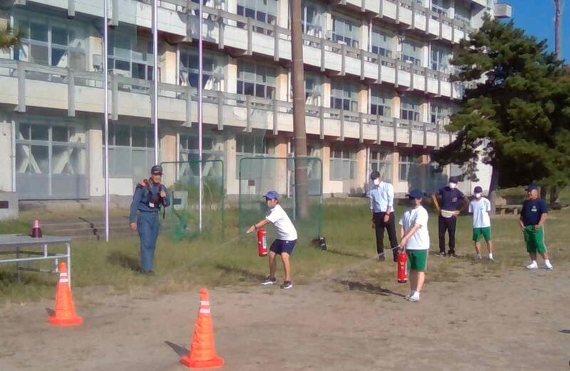 また、水消火器で各学年代表の生徒と先生が初期消火訓練を実施しました。