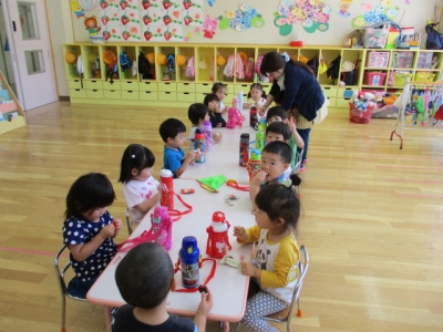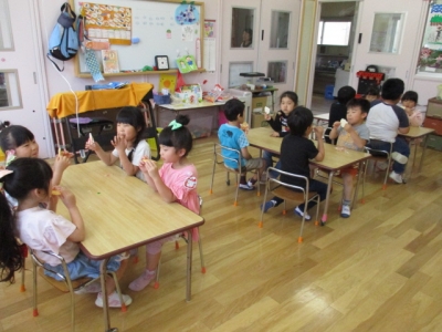 2017年6月2日 11時12分 10時になりました。おやつの時間です。年長さんはおせんべいを、年少さんはクッキーを、年中さんはすでにいただき終わりました。
