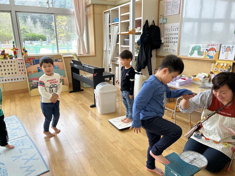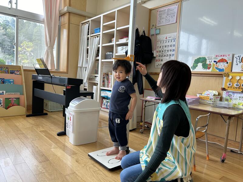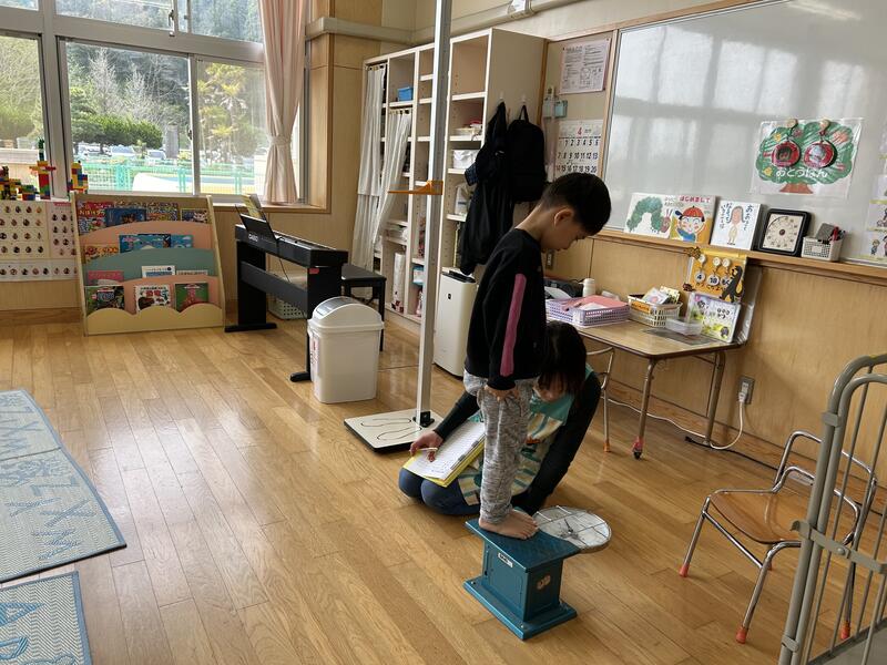幼稚園では、もも組さんとたんぽぽ組さんが発育測定中。
