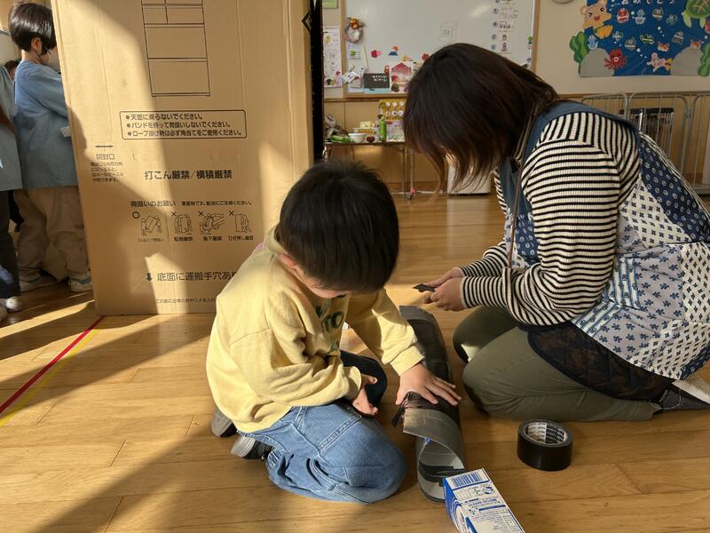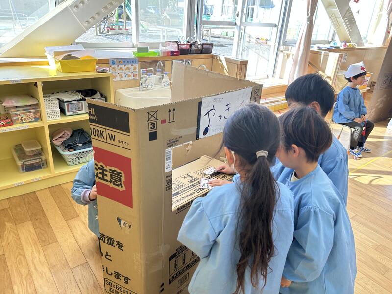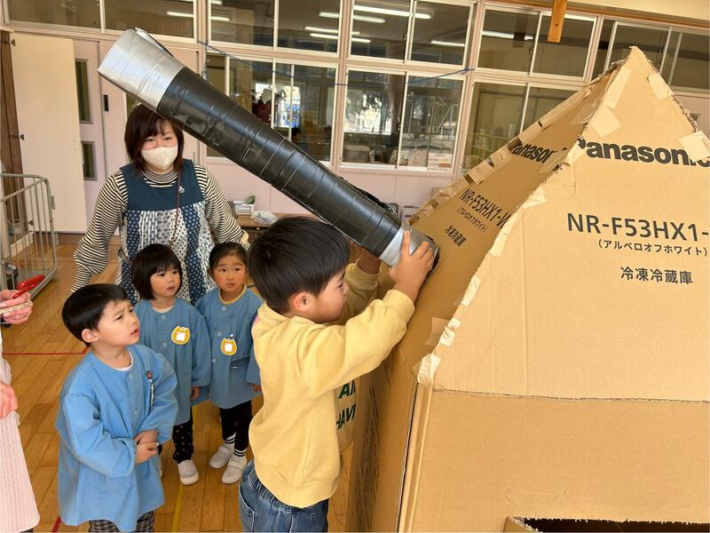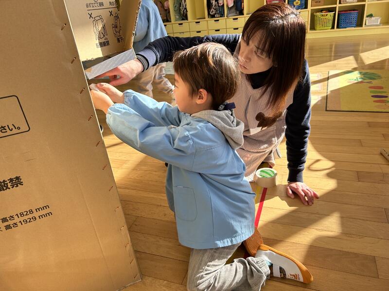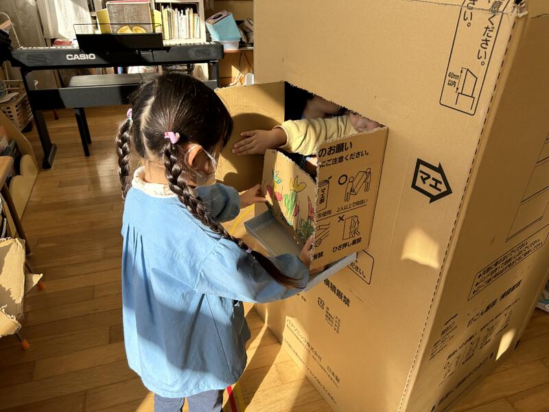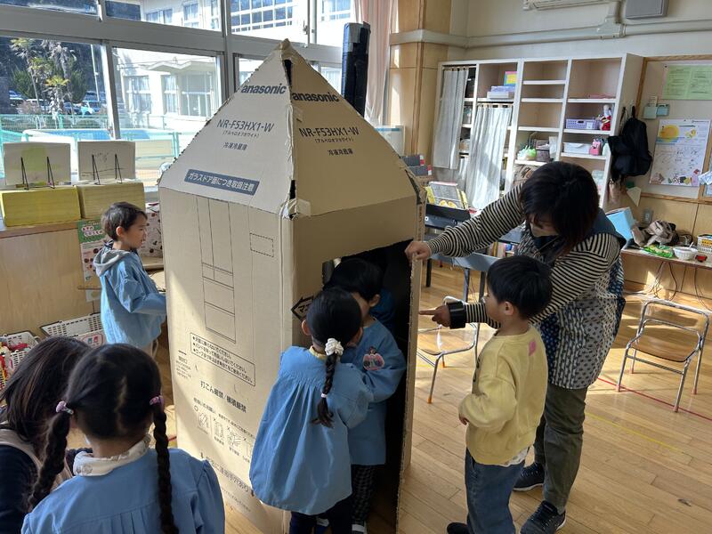 もも組さんでは大きなお家が完成し、友だちとごっこ遊びを楽しんでいます!