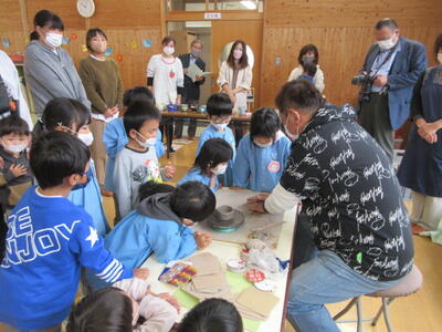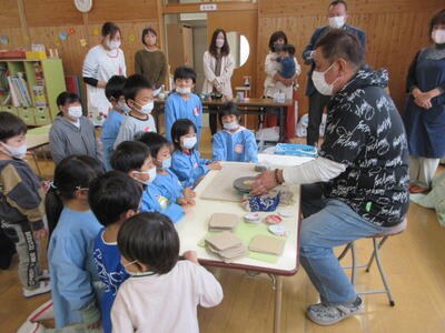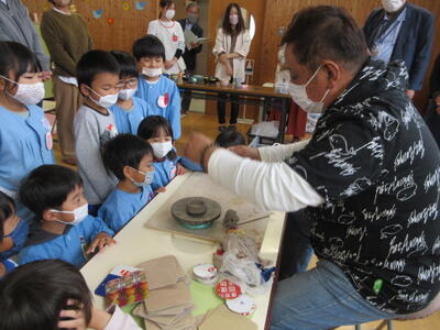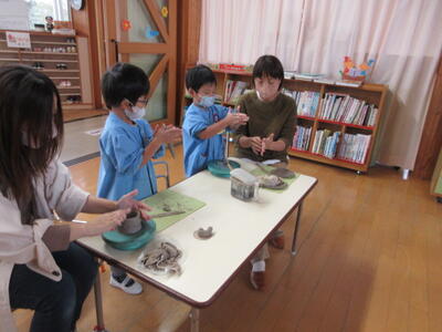 陶芸の指導は大堀相馬焼窯元 春山窯の小野田利治先生が講師を務めてくださいました。どんな風に作っていくのかきく組・もも組の子どもたちは興味津々で作り方の説明を聞いていました。