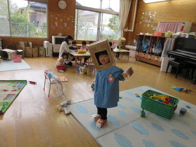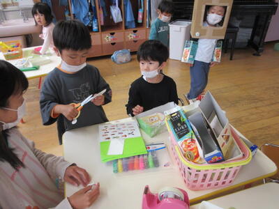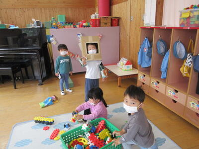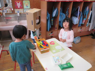 うめ組さんの遊びの様子です。最近は、友達と一緒のもので遊びたいという気持ちが出てきて、クラスの友達と一緒のものを作ったり、身に着けたりしながら遊びを楽しんでいました。