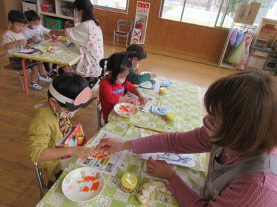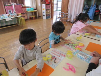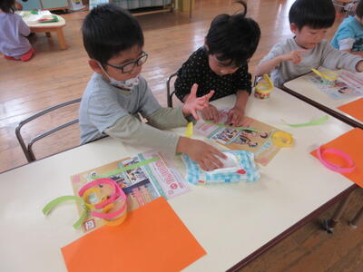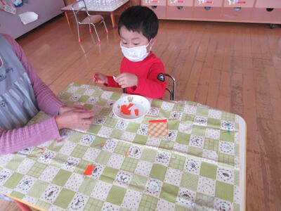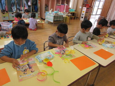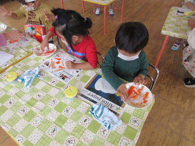 うめ組さんは、折り紙をちぎって、かぼちゃ作りをしていました。