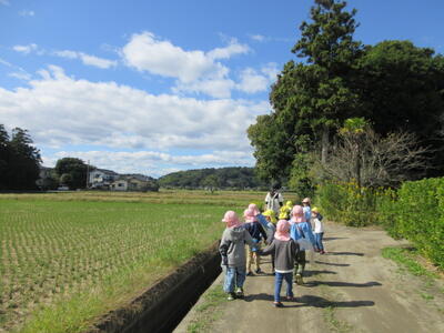 お散歩に出かけたきく・もも組さん。ちょうど大浦小の5年生が学習田で稲刈りの体験をしていたので見学させてもらいました。