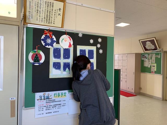 2019年11月7日 16時14分11/5(火)、 教養委員会図書室環境グループによる活動が行われました。 この日は、事務室前の掲示板や、1階中央廊下を、 ひと足早くクリスマスバージョンに飾り付けました。