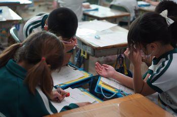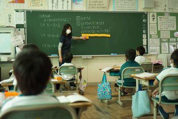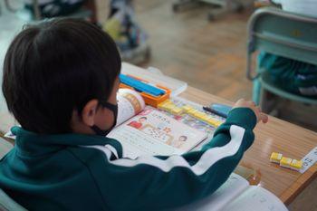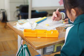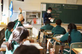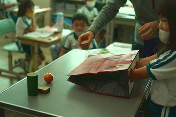1年3組の算数は、立体図形を、見ないで手で触ってどんな形なのか伝える学習を行っていました。