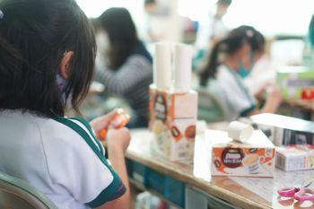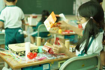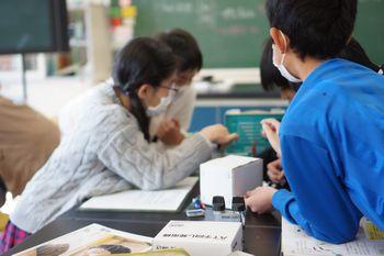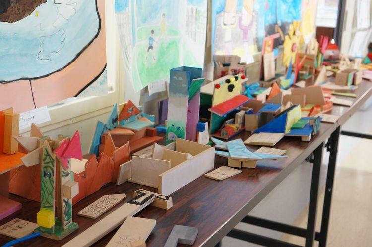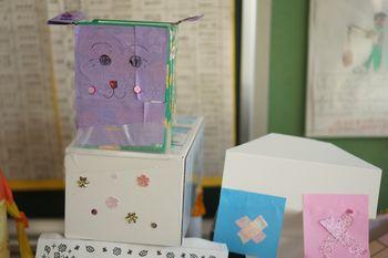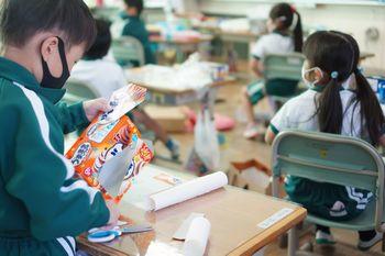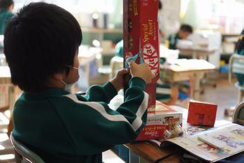 1年生は、3学級とも図工の学習に取り組んでいました。箱を使って作品を作っています。