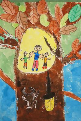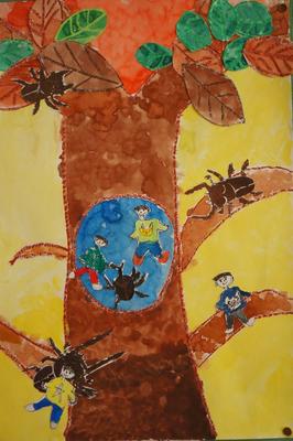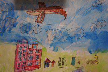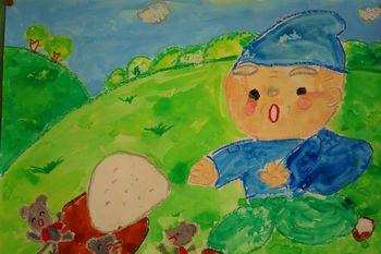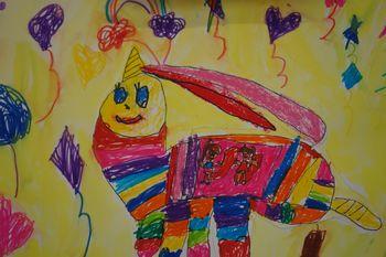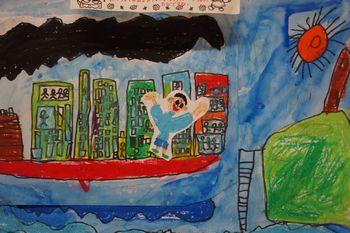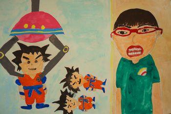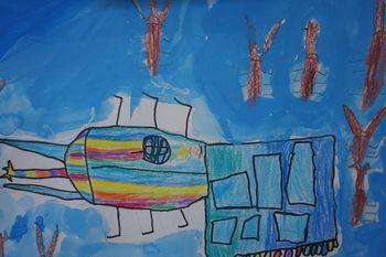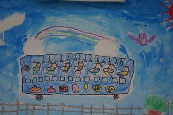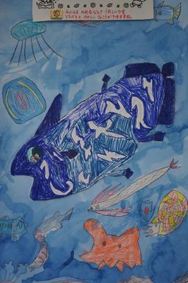 1年生廊下に掲示された図工作品です。楽しそうな世界が広がっています。