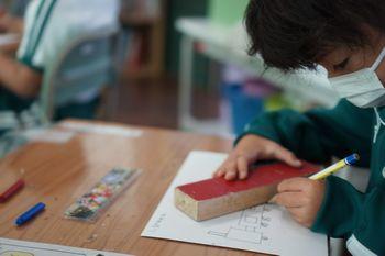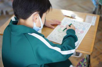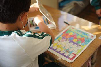 1年1組は算数の学習中です。立体図形を紙に写し取って絵にする活動を行っていました。