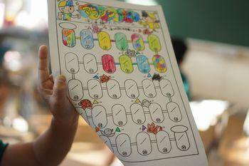 1年生は、校庭を走った後に、マラソンチャレンジカードへの書き込みを行っていました。