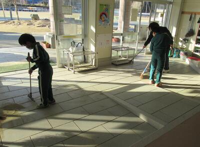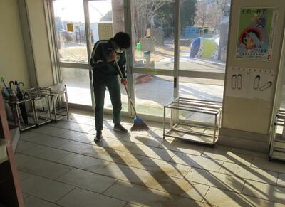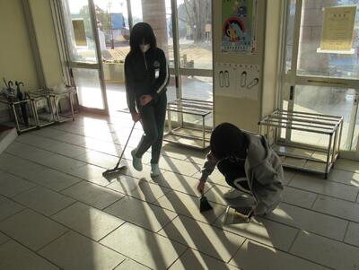朝の活動の様子です。美化緑化委員会のみなさんが昇降口の掃除をしてくれています。
