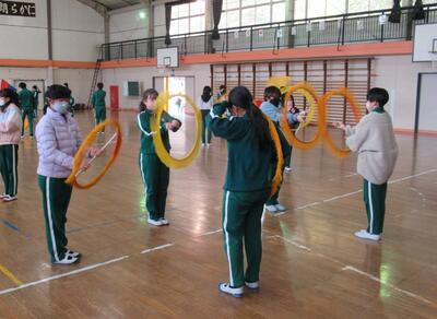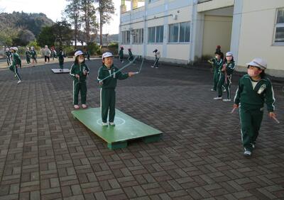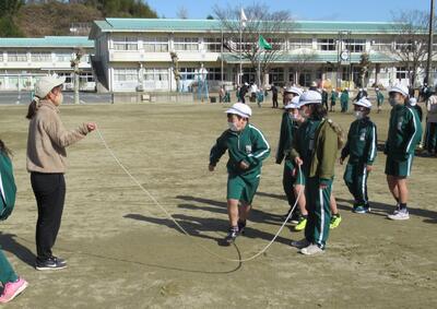 授業の様子です。1年生は、体育でなわとびです。うしろ跳びの練習です。
