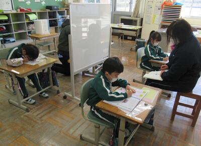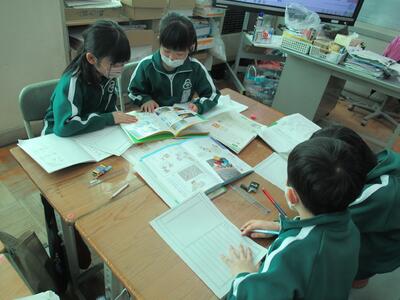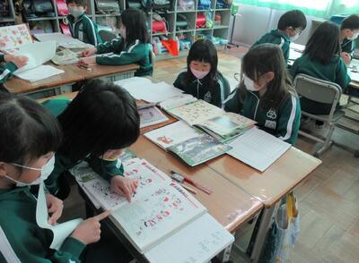 2年生は、国語のグループ学習です。いろいろなあそびを紹介する文を考えていました。