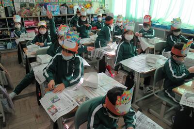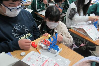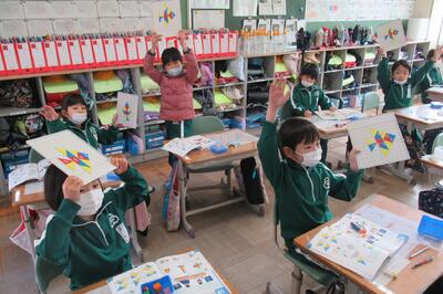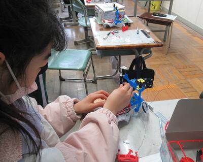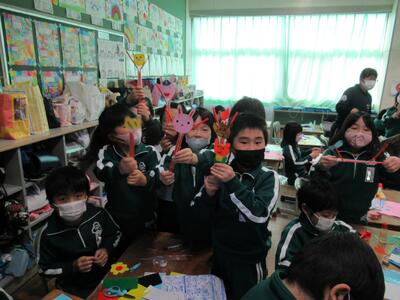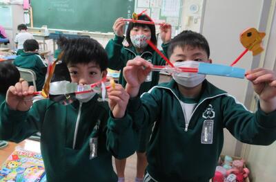 2年生は図工です。ストローを使ってパタパタと動く作品をつくっていました。
