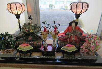 今年も校長室前の廊下に立派なひな人形が飾られました。外は雪が降っていますが、春が感じられます。