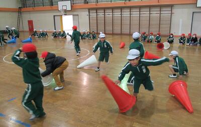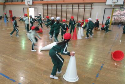 1年生は体育です。カラーコーンを使って、倒す数と立たせる数を競うゲームをしていました。