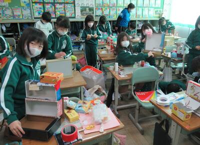 2年生は、図工です。箱を使って「ともだちハウス」をつくります。