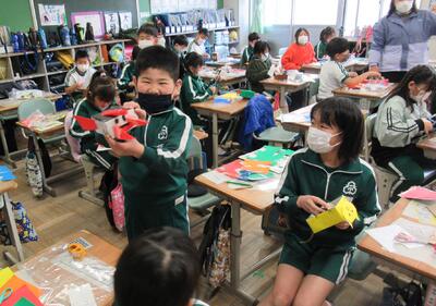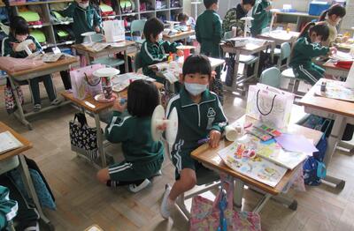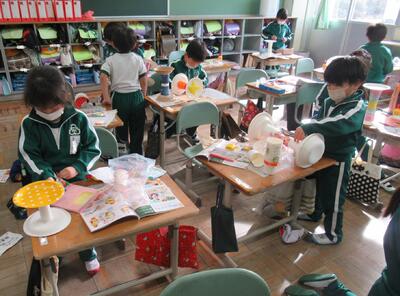 1年生は、図工です。紙皿を使って転がるおもちゃを作っていました。
