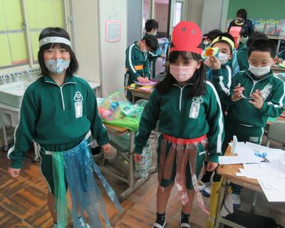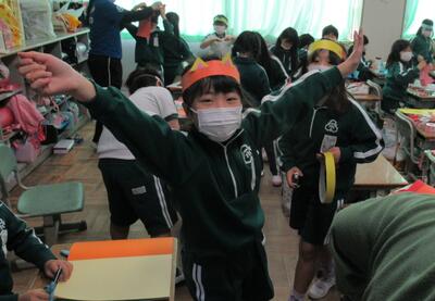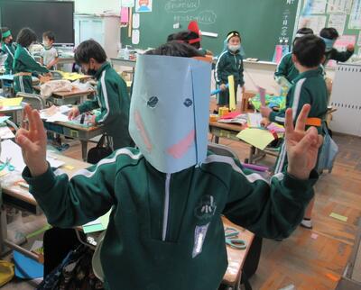 2年生も図工でした。わっかを使って変身します。
