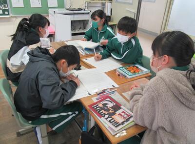 6年生は、国語の学習です。説明文の表現の特徴を読み取り、グループで確認し合います。