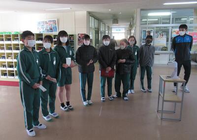 代表委員会のみなさんは昇降口ホールで「書き損じはがき等」の寄付を募る活動をしていました。