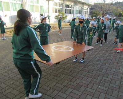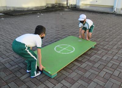インターロッキングでは、なわとび大会に向けてなわとびの練習をしています。体育委員会のみなさんがジャンピングボードを準備してくれます。